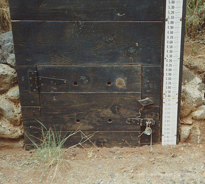 The image shows a dark wooden door secured with a metallic padlock and hinges, alongside a vertical measurement scale attached to rock and soil.