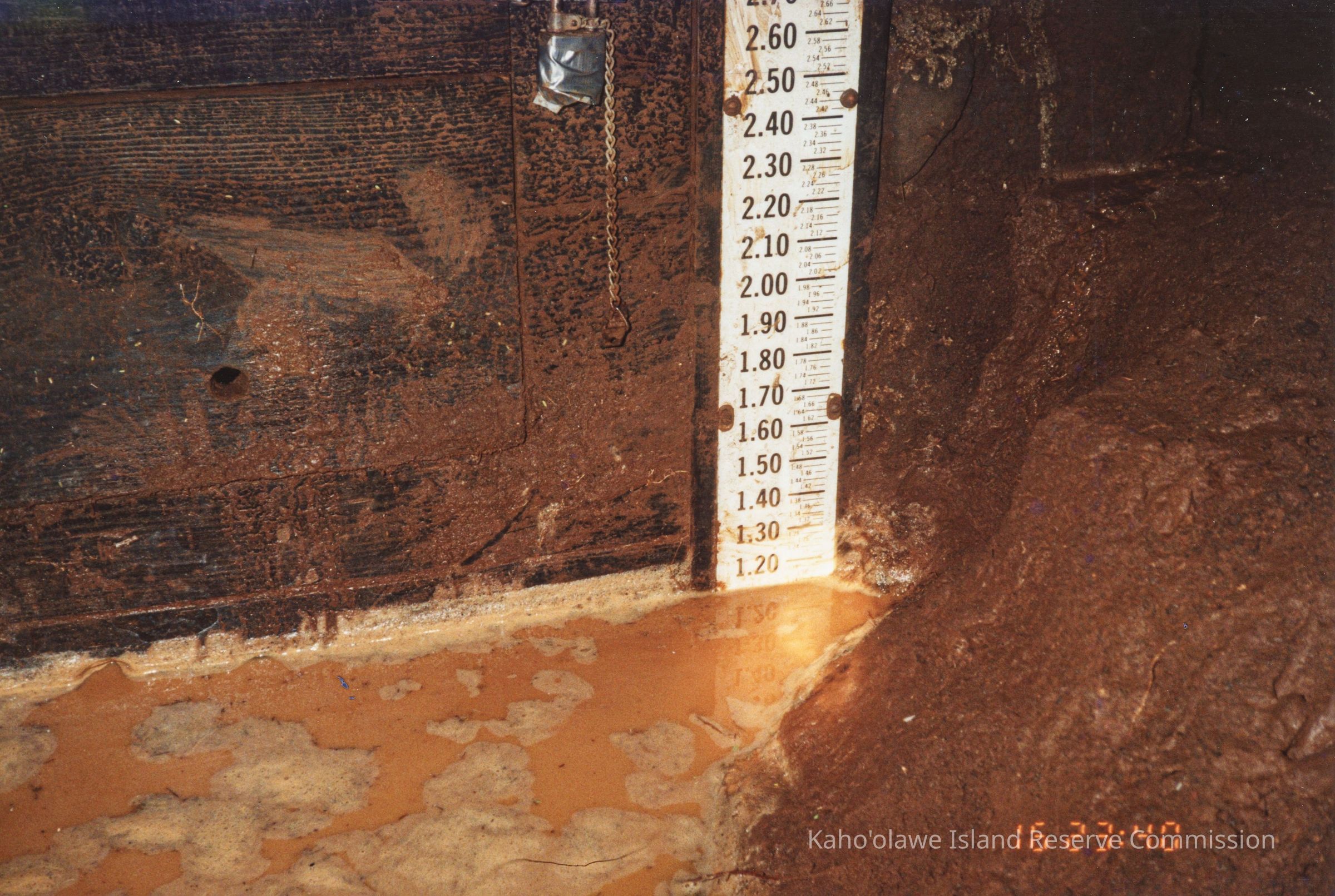 The image shows a vertical water gauge marked with measurements, partially submerged in muddy water, indicating the current water level.