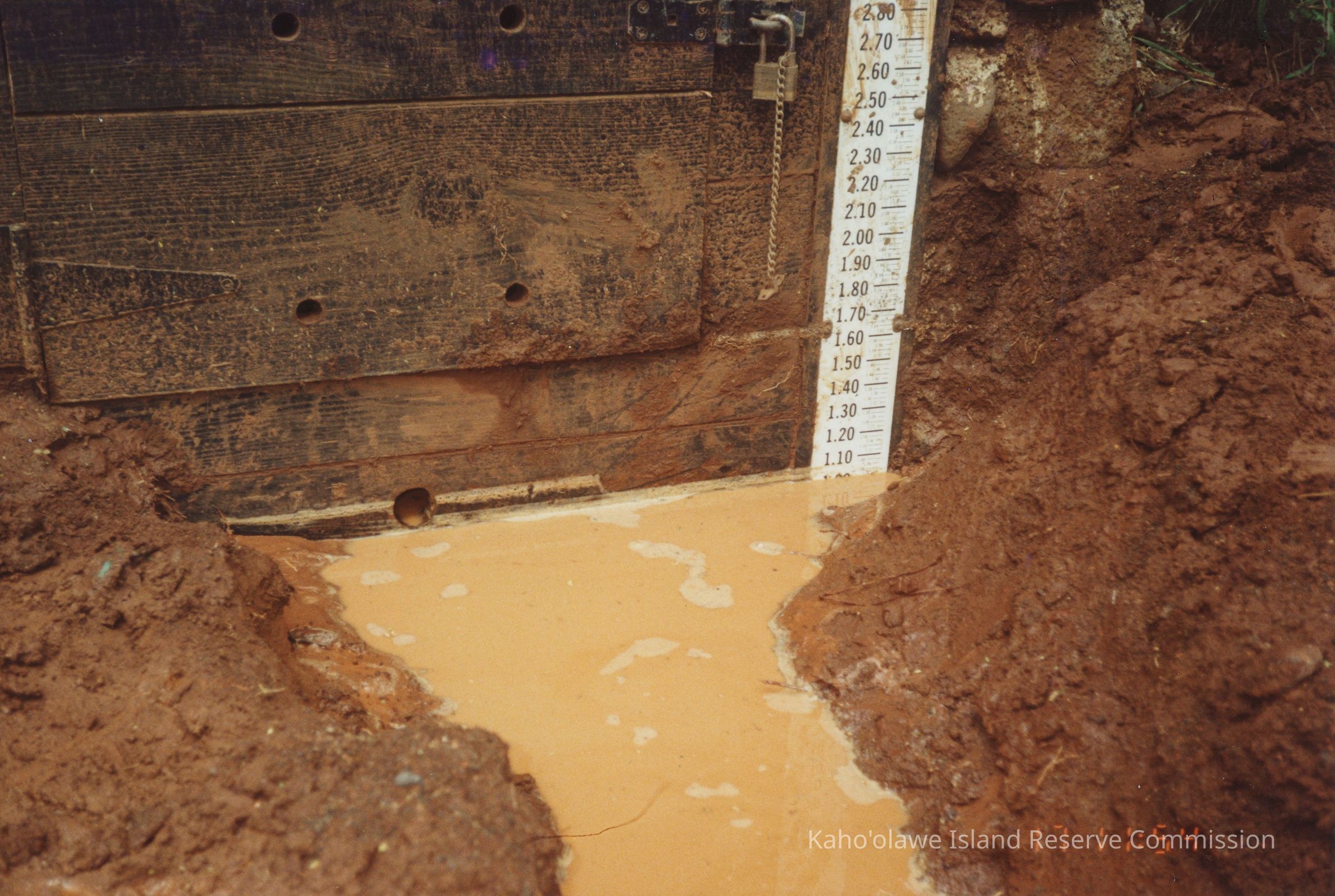 The image shows a water gage next to a wooden structure, surrounded by muddy soil and measuring water levels.