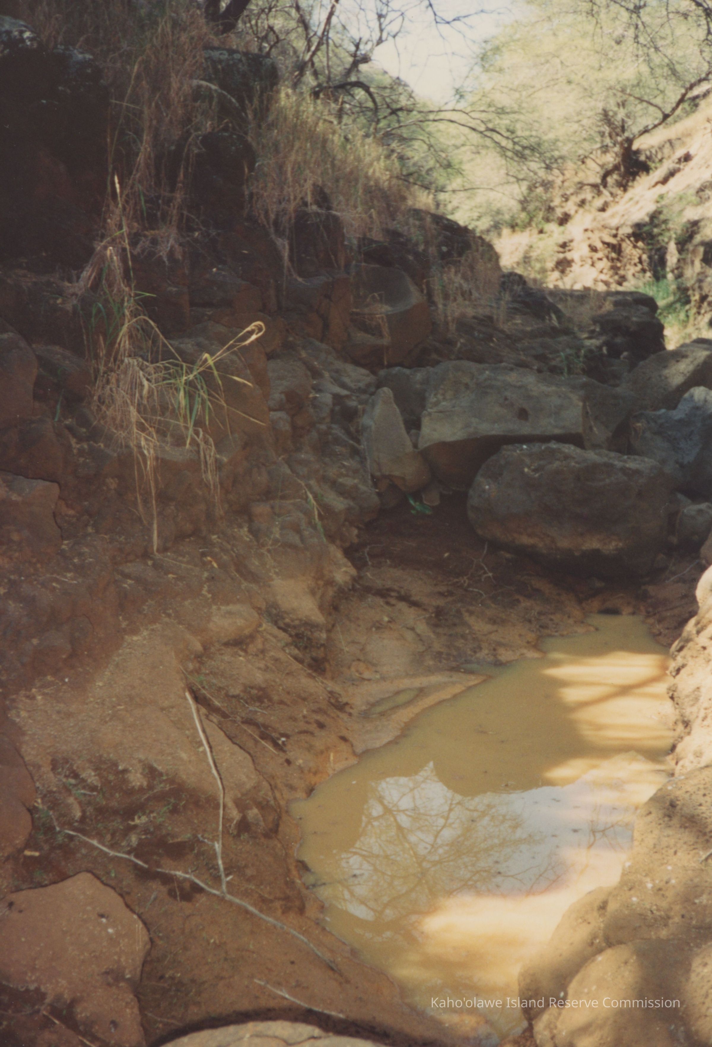 A small, muddy puddle reflects the surrounding bare branches and rugged terrain, providing contrast to the rocky landscape.