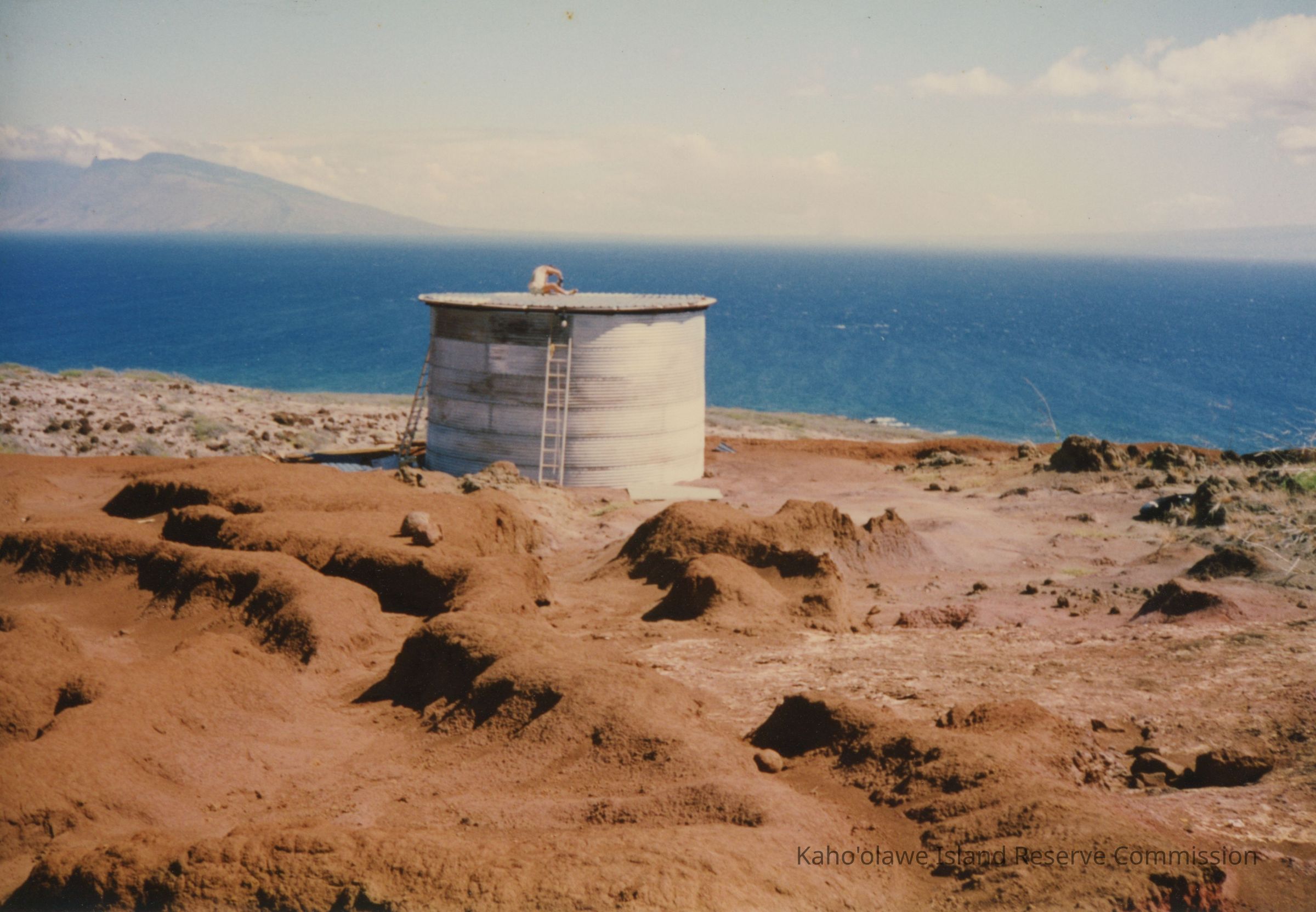 Color photograph of a corrugated metal water tank set on hardpan terrain. There is a person working on top of it and two ladders leading against it. The ocean and Maui are in the far background.
