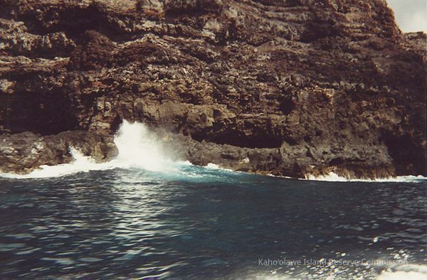 Color photo of waves crashing along the Kaho'olawe coastline taken from the ocean, possibly from onboard the Hakilo.