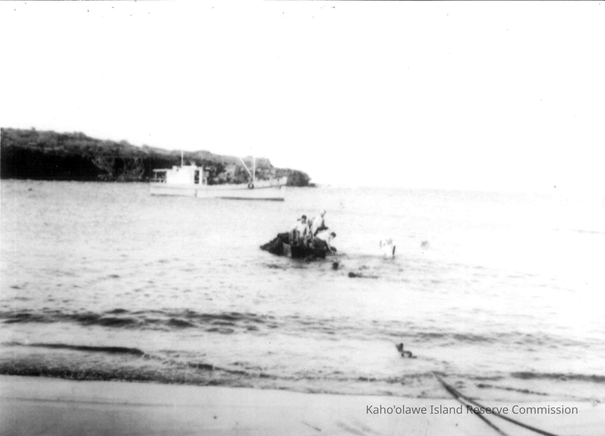 Digital image of black & white print of whale boat with unidentified men loaded on both sides with cattle headed out to the Mazie C.Photograph Details