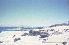 Film negative an unidentified white sandy beach with black rocks. The island of Lana'i is in the background.Collection