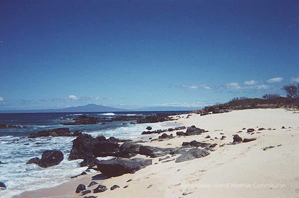A color photo of a white sandy beach with black pohaku (rocks) scattered along it in an unidentified area. The island of Maui is in the far background.Collection