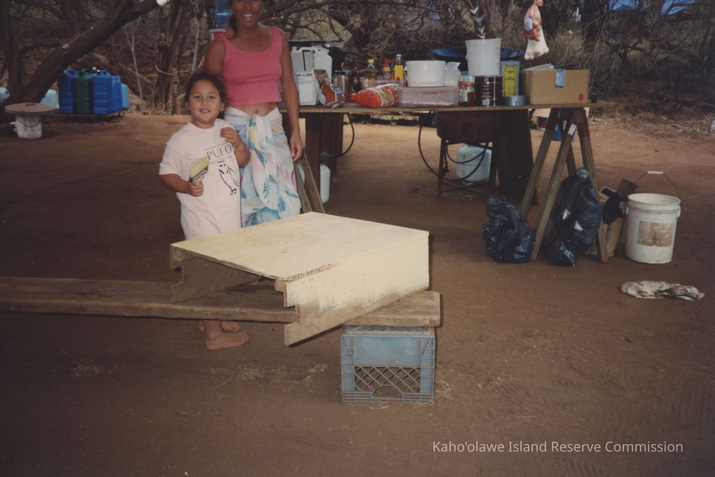 A color photograph of an unidentified woman and child looking at the camera next to a makeshift table covered with food and containers. They are standing under a shelter near a grove of trees. This photo was probably taken in Hakioawa.