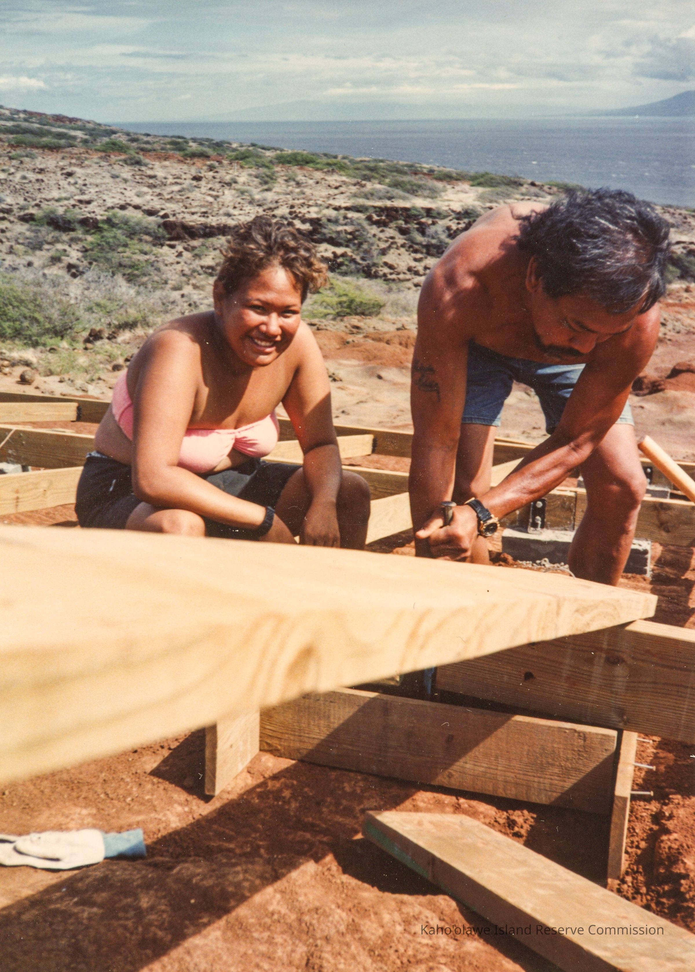 Color photo of an unidentified man working on a wooden frame while an unidentified woman smiles at the camera. The PHoto was probably taken at Wailuna in Hakioawa 'Ili.