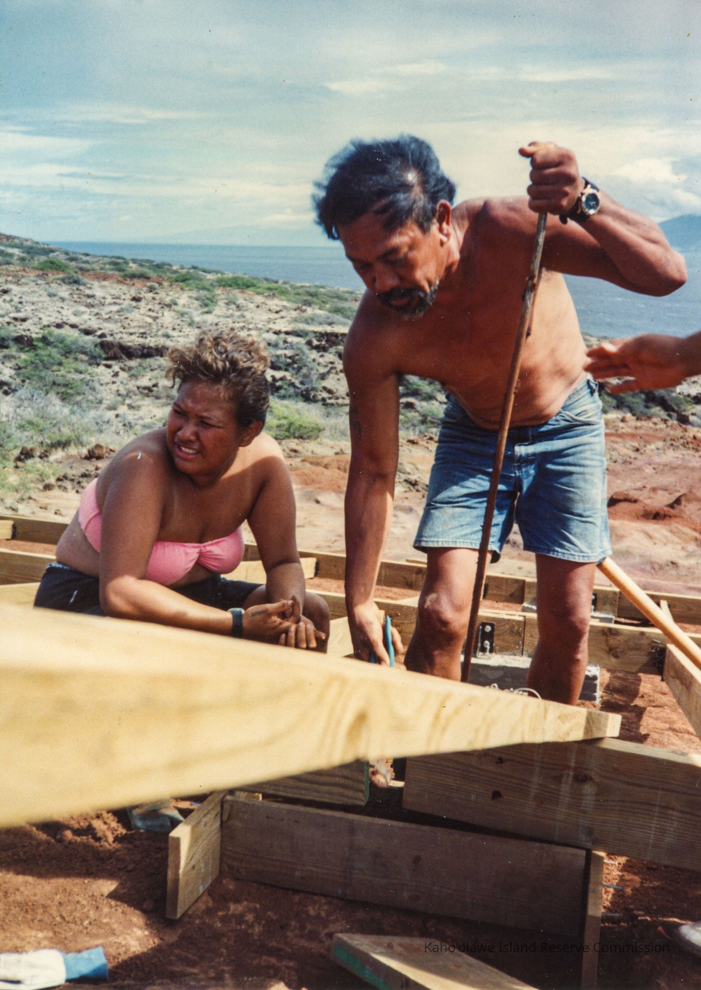 Color photo of an unidentified woman and man working on a wooden frame. The woman is sitting and the man in placing something along the frame. This photo was probably taken at Wailuna in Hakioawa 'Ili.