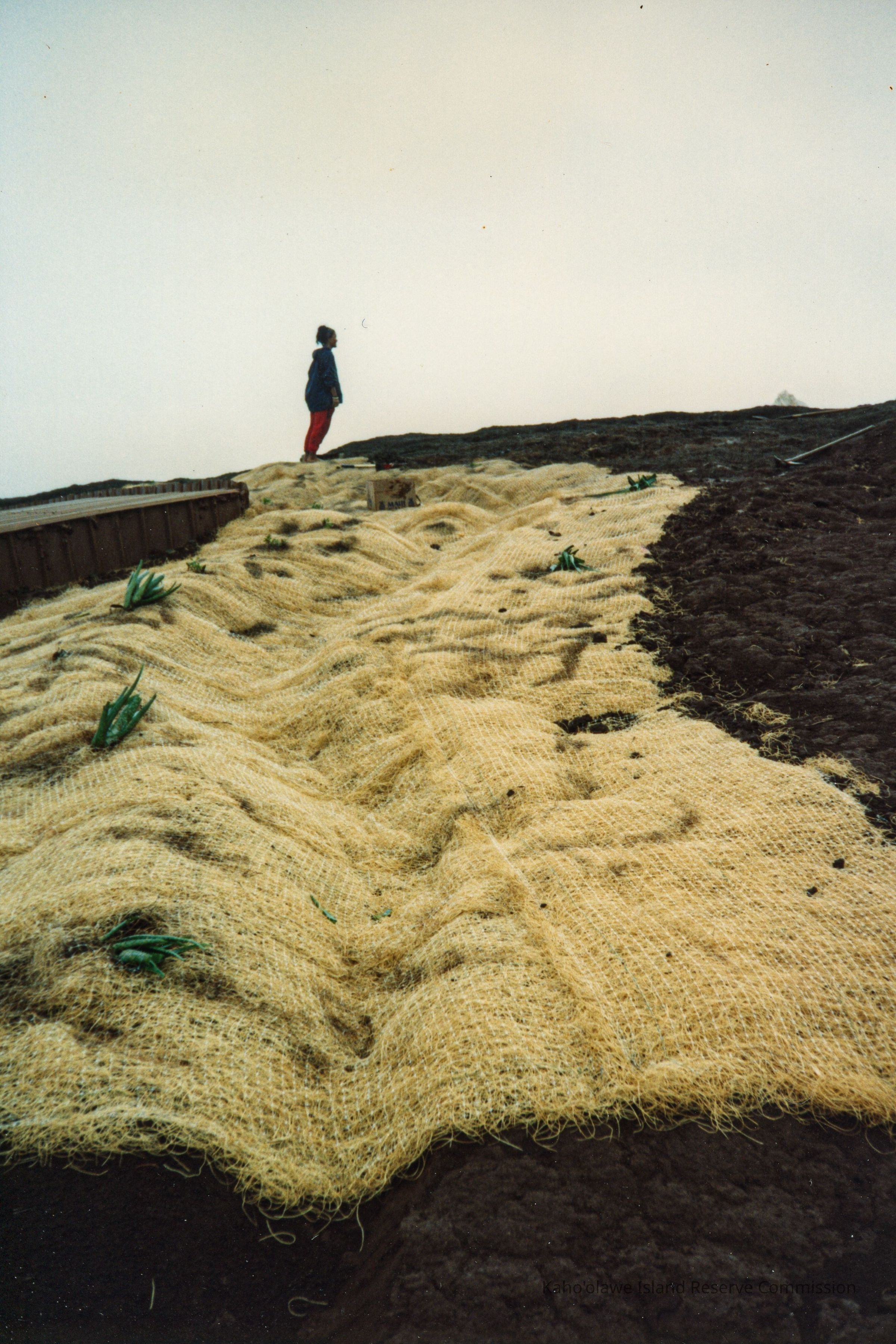 Color photograph of an unidentified woman standing in profile on fabric matting. There are several plantings growing through the fabric matting set on hardpan terrain. Handwritten text on previous pagein the original photo album states: "March 1994 3 Day Regular Access. Tank Cover Flew Off!"