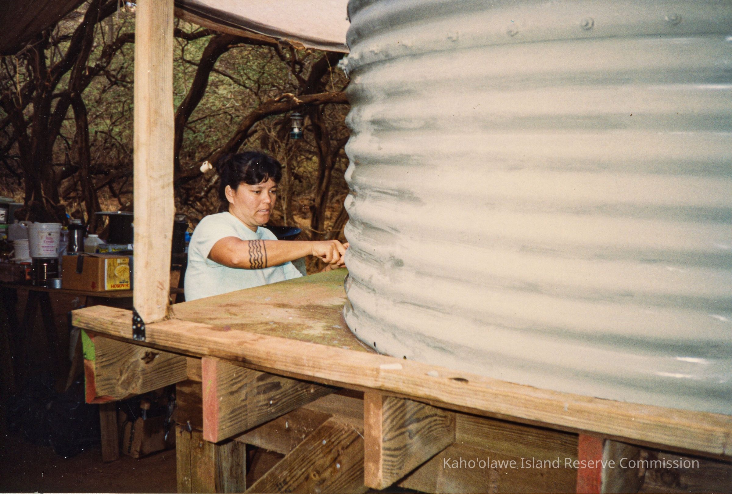 A woman dressed casually is working at a large corrugated metallic cylinder, surrounded by various items and trees in an outdoor setting.