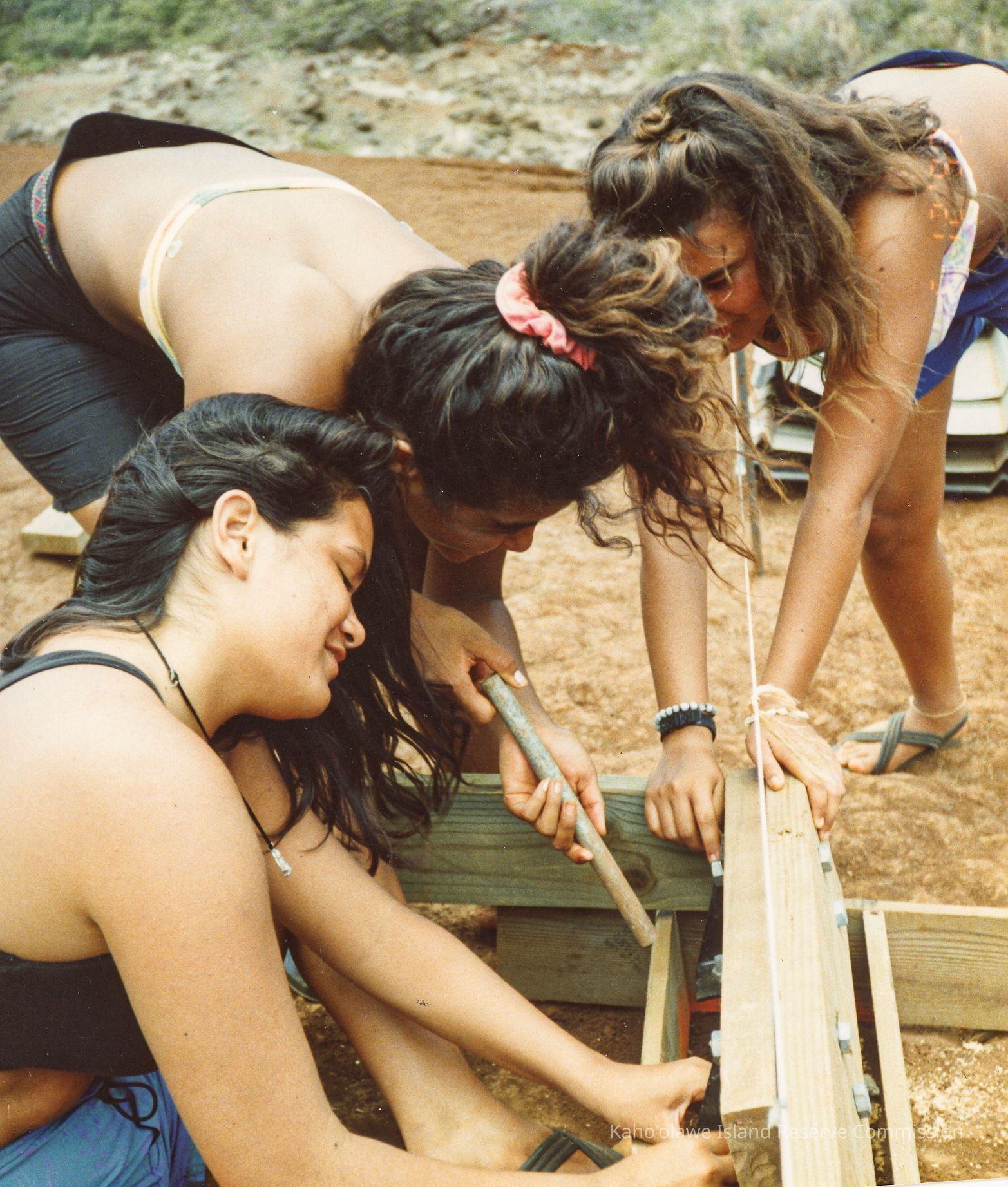 Three young women are collaboratively working on a woodworking project outdoors, using a hand saw to cut through a plank of wood.