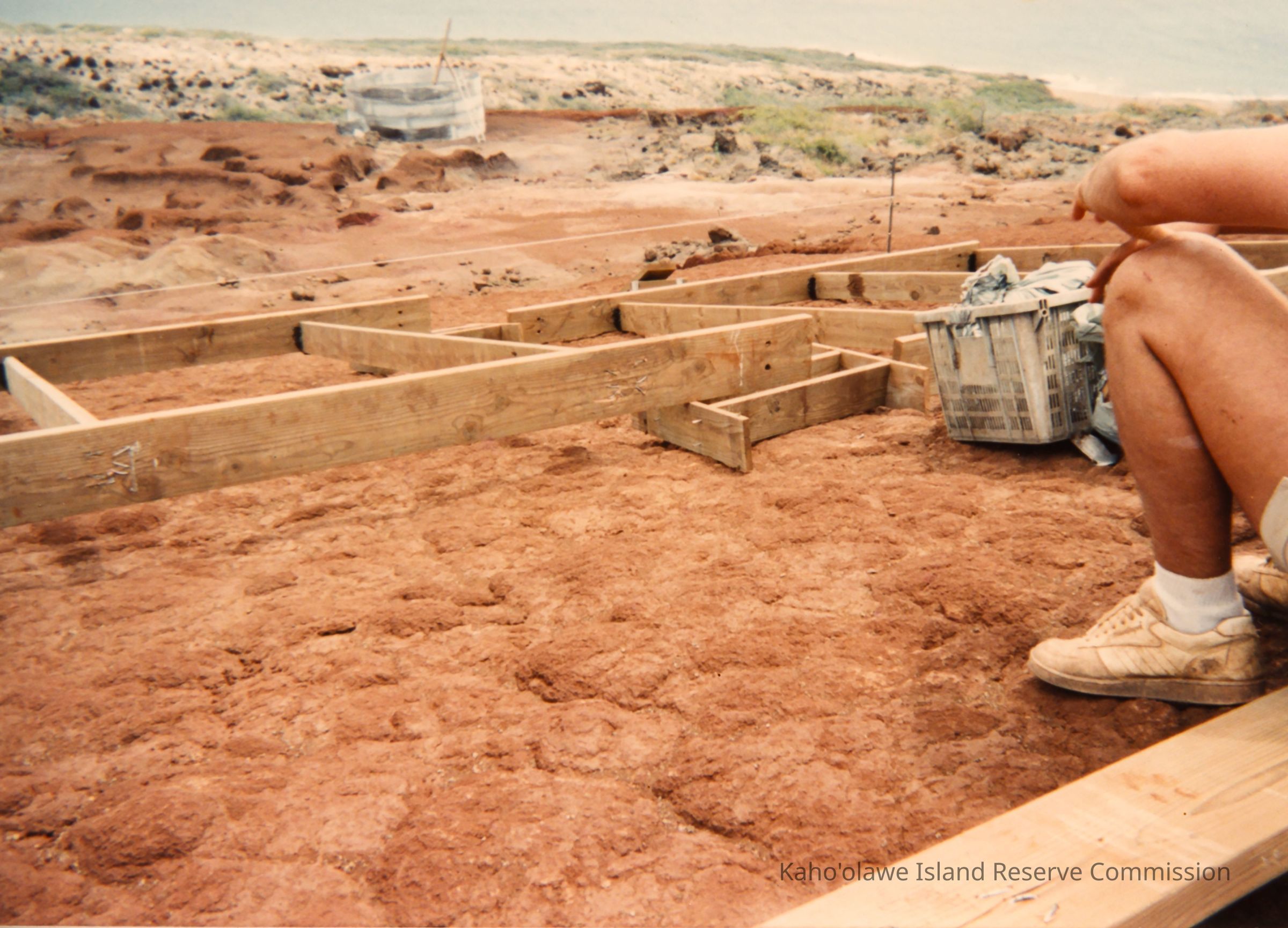 Closeup of a wooden frame. There is a leg of an unknown person and filled open gray crate to the right. A partially constructed corrugated metal water catchment structure is in the far background. This photo was probably taken at Wailuna in Hakioawa 'Ili based on the presence of the water catchment structure. There are two copies.