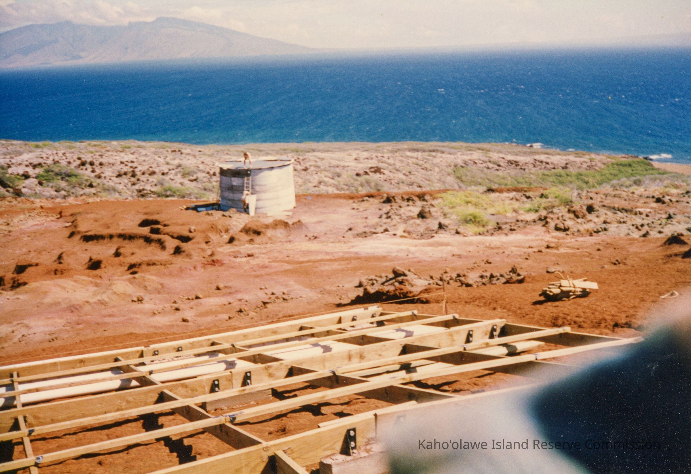 Color photograph of a wooden frame of a water catchment structure and a corrugated metal water tank in the background, along with the ocean and Maui. There is a man standing on top of the water tank.