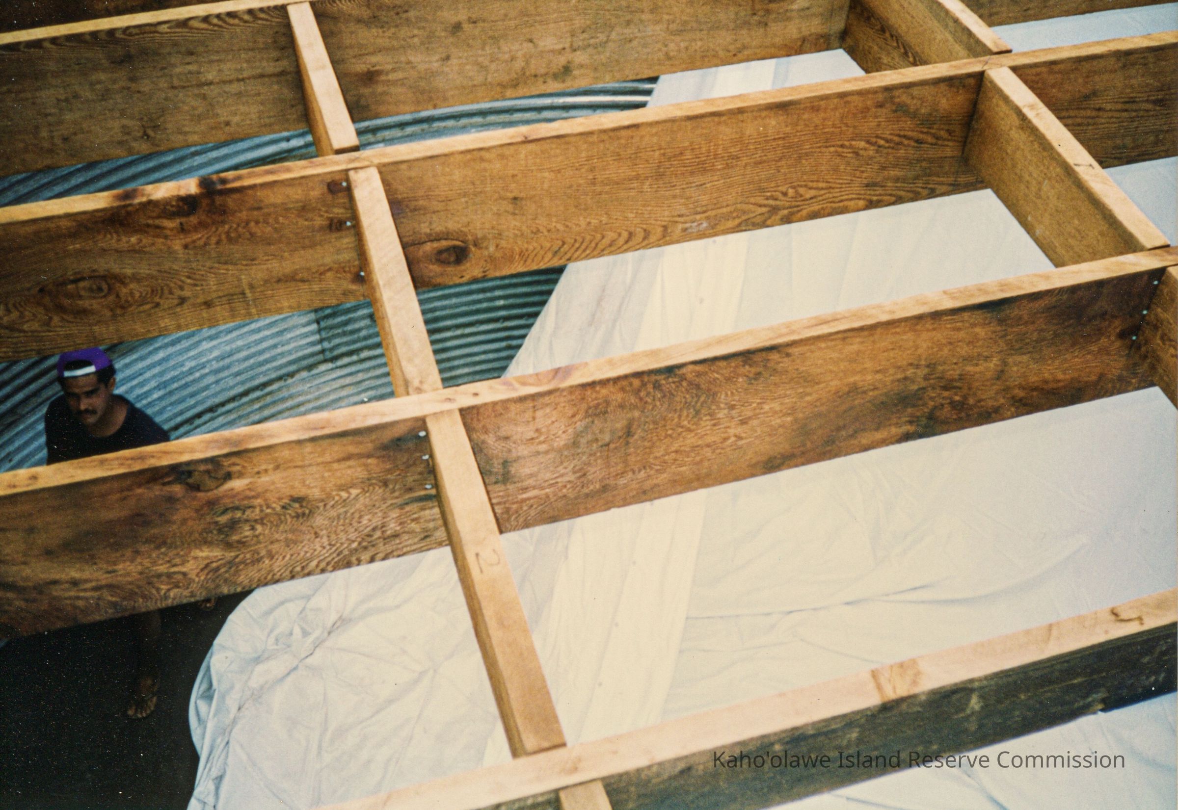 Color photograph of wooden frame grid laying across the top of a corrugated metal water tank. An unidentified man is standing below along with a large tarp.