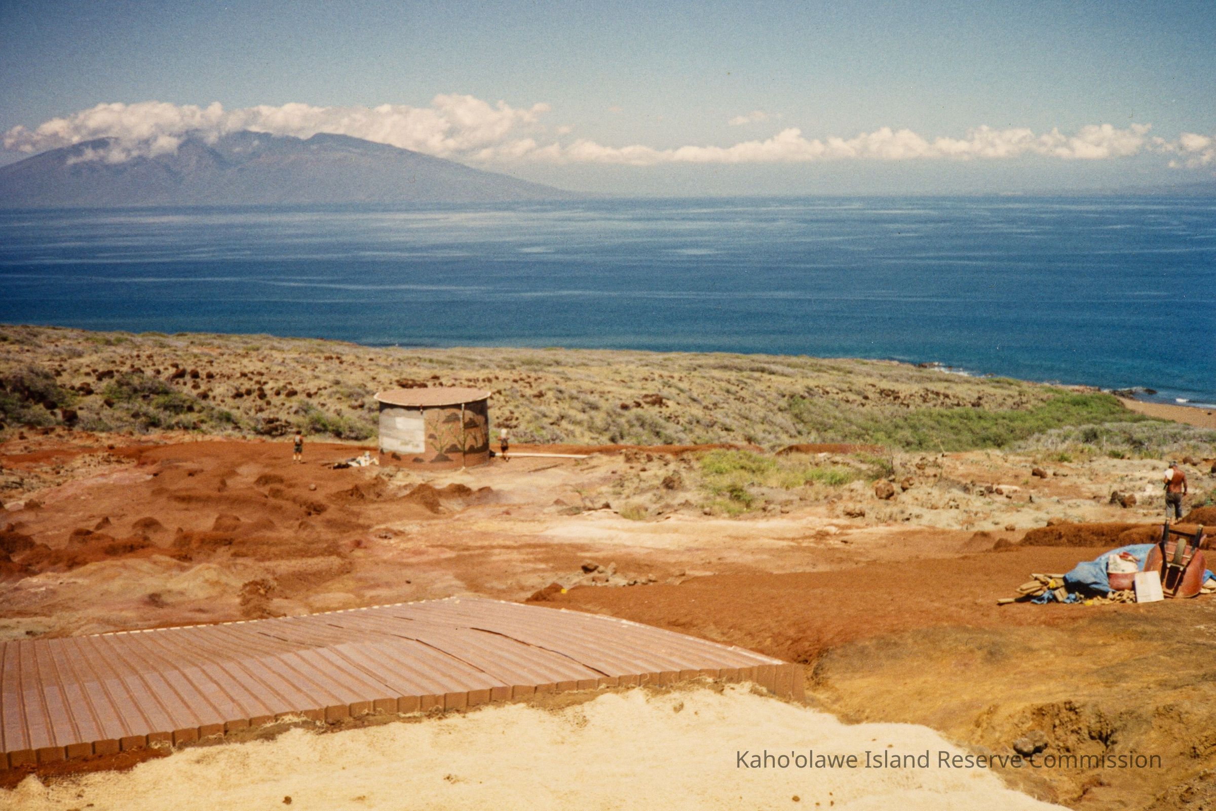 The image shows a coastal landscape with a constructed structure on hardpan, adjacent to a boardwalk, overlooking the ocean.