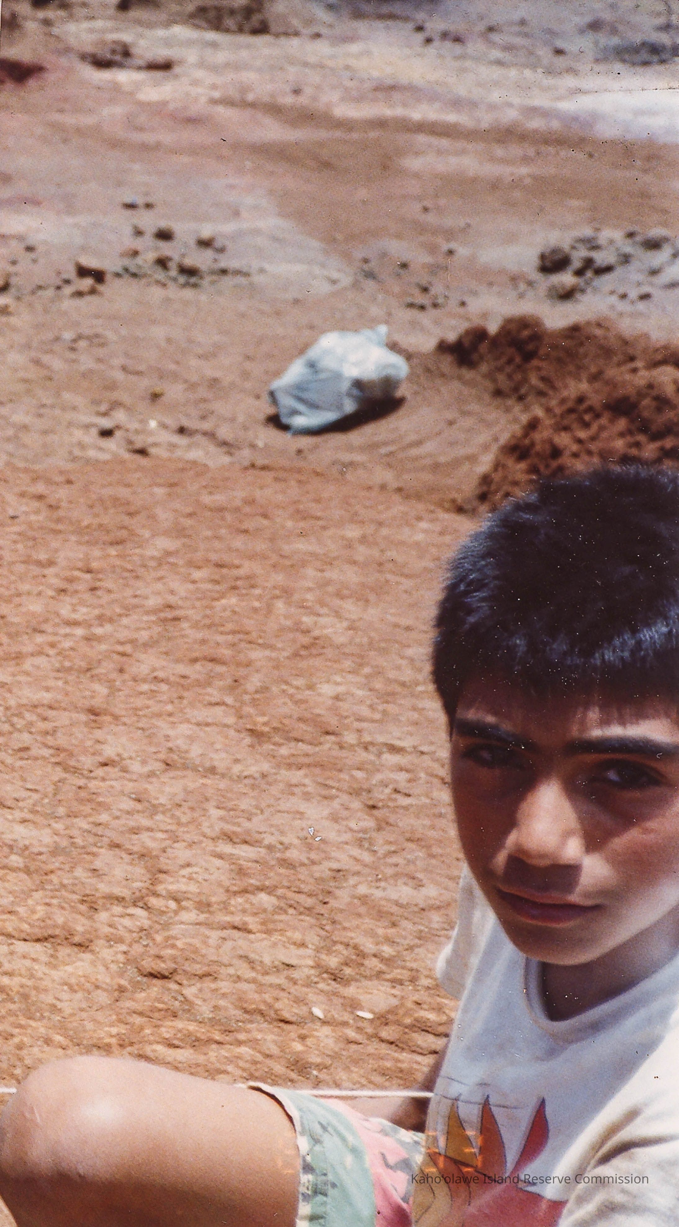 A young man with short hair looks at the camera in an outdoor setting, sitting with dusty ground and rocks in the background.