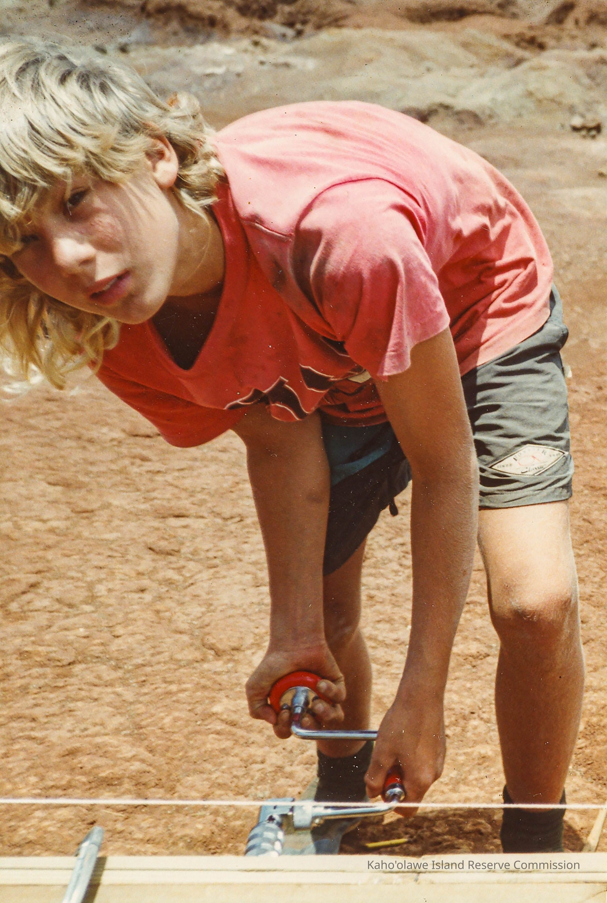 A young person in a torn red t-shirt is bending over a wooden frame, intently using a hand crank drill to adjust a component on the frame.