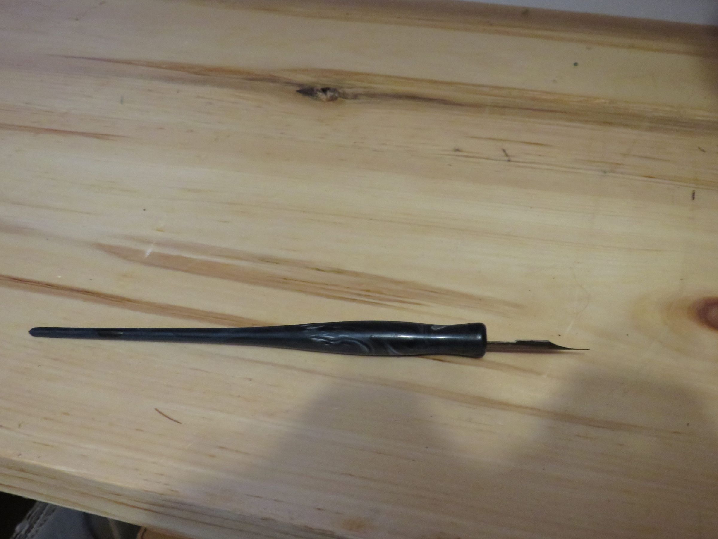 A fountain pen, the handle is made of a basic form of plastic, there are swirls in the plastic of lighter colours. The fountain nib is marked with "W. Speedwriter, Warranted, Hinkswell, England"