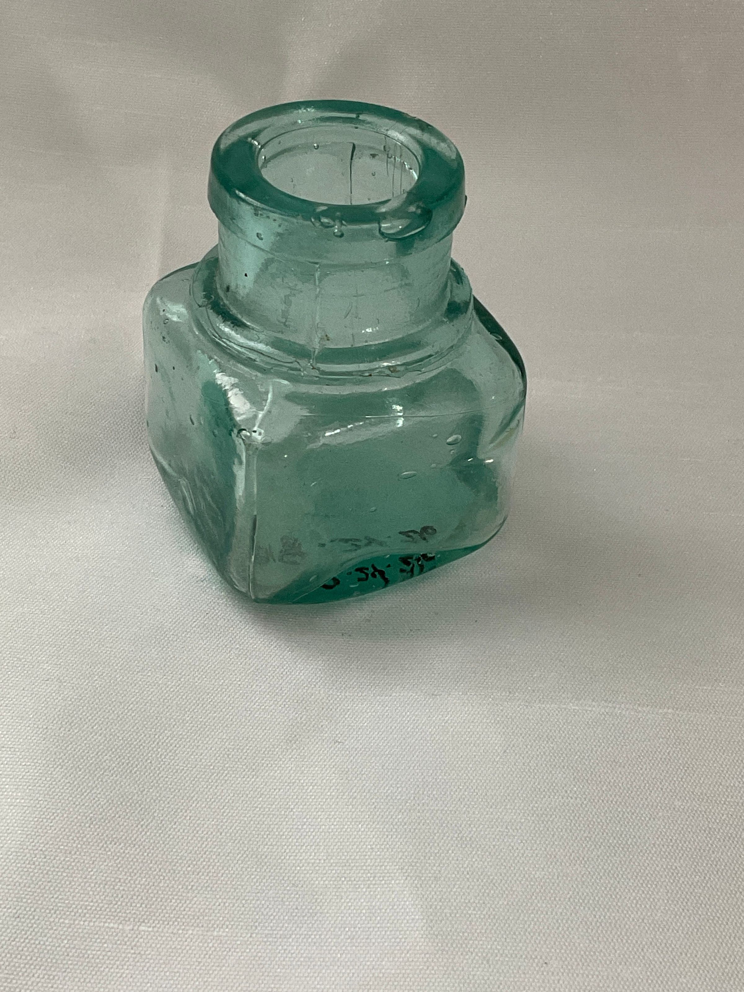 Green glass inkwell four sided top of spout is large opening 1.5" x 1.5" x 2"