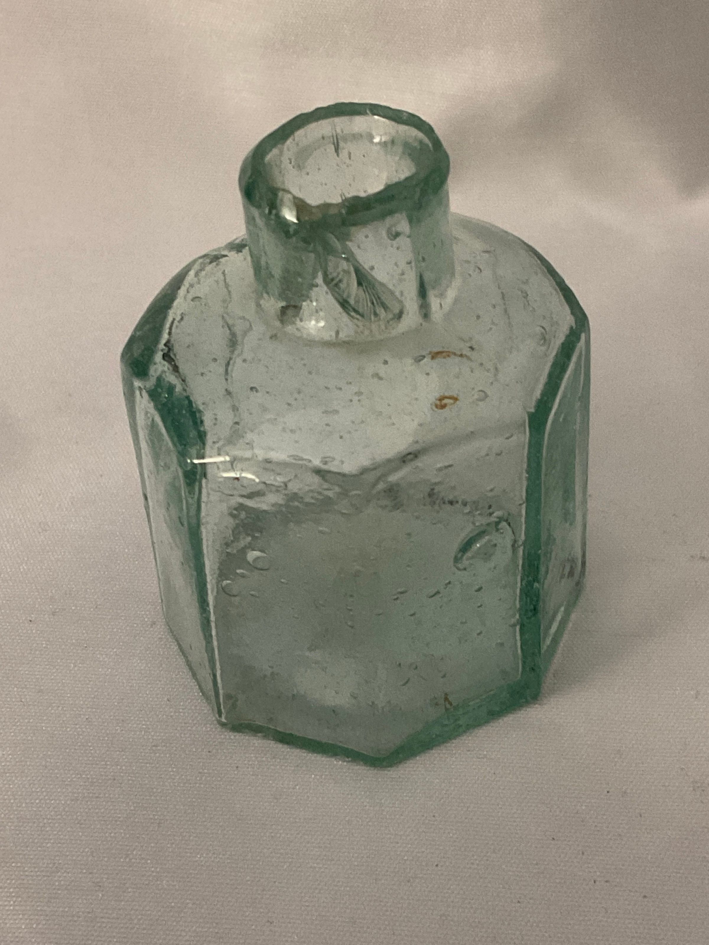 Green glass inkwell 1.75" wide with eight sides neck of bottle chipped and rough.