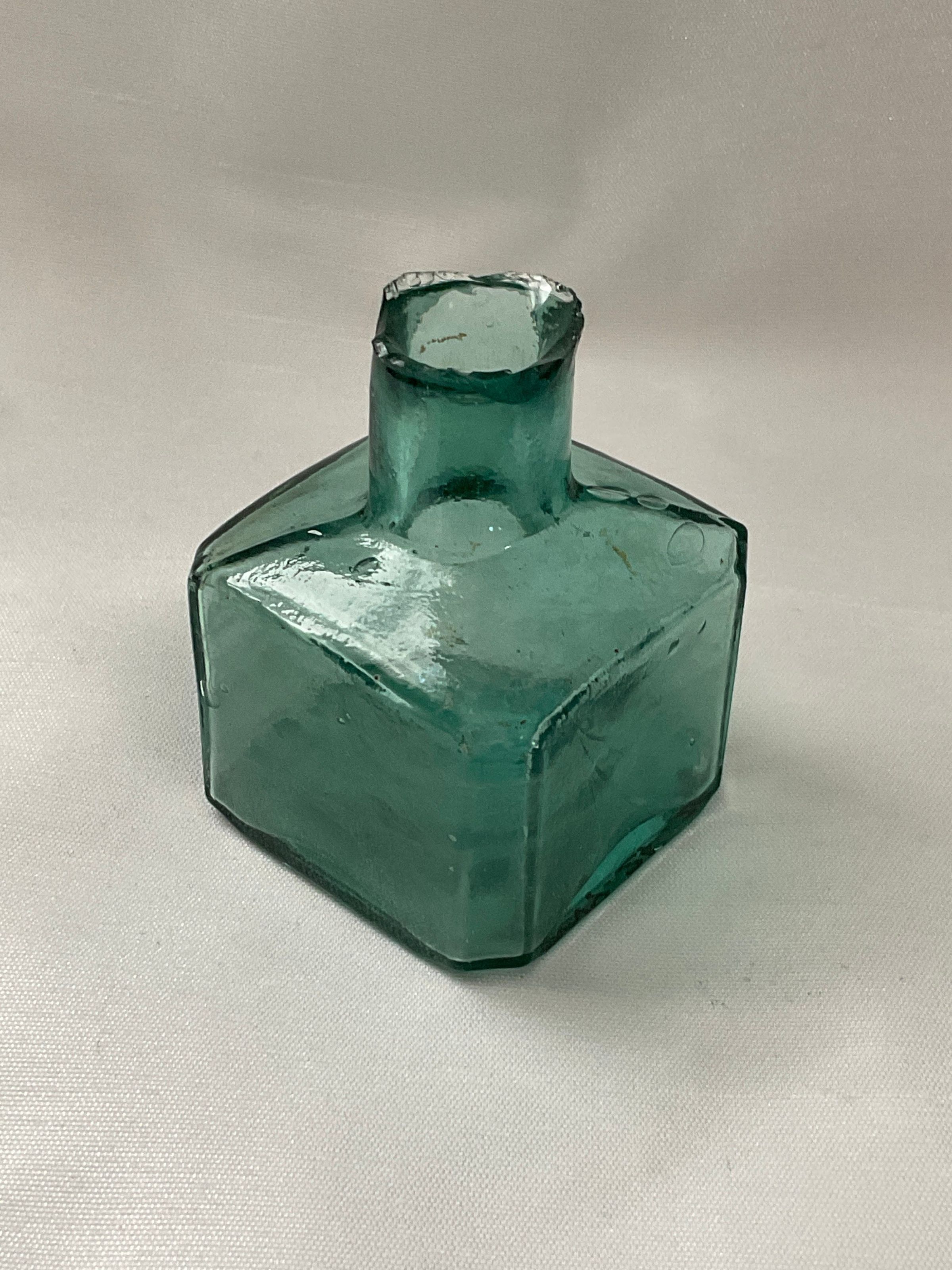 Green glass inkwell four sided top of spout is chipped