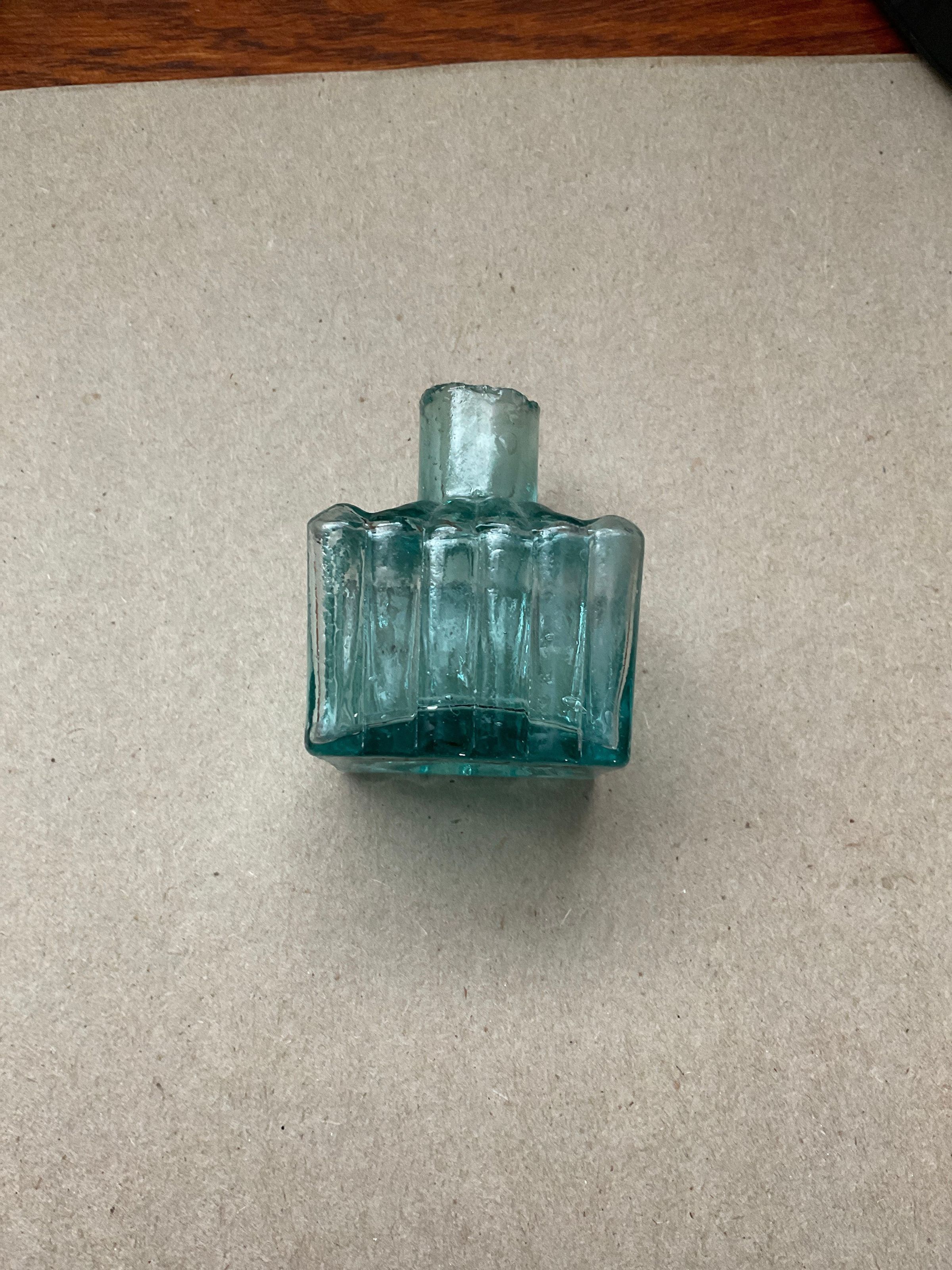 Green glass inkwell four sided 1.75" x 1.75" x 2.25" top of spout chipped. Scalloped on three sides