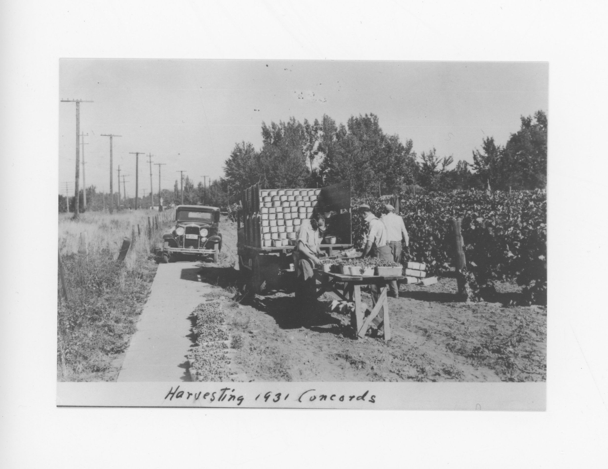 Harvesting concord grapes from Kaysville vineyard. Lester Gleason is on the left of the table. The other men are unidentified.Photograph Details