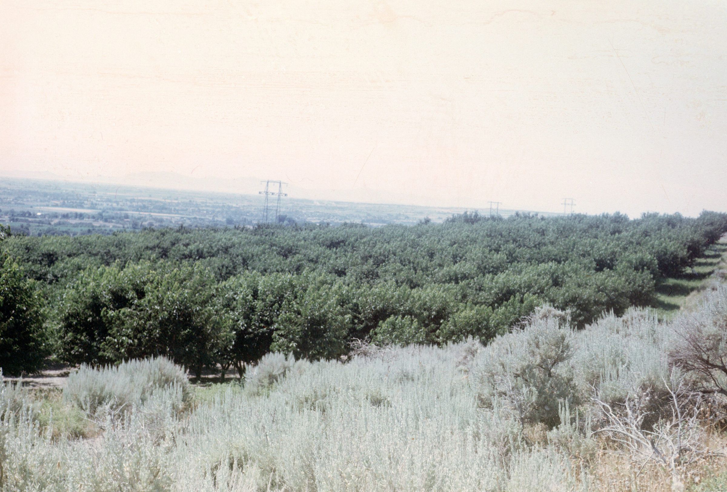 Burton family orchard below sagebrush covered mountain bench in Fruit Heights.Photograph Details