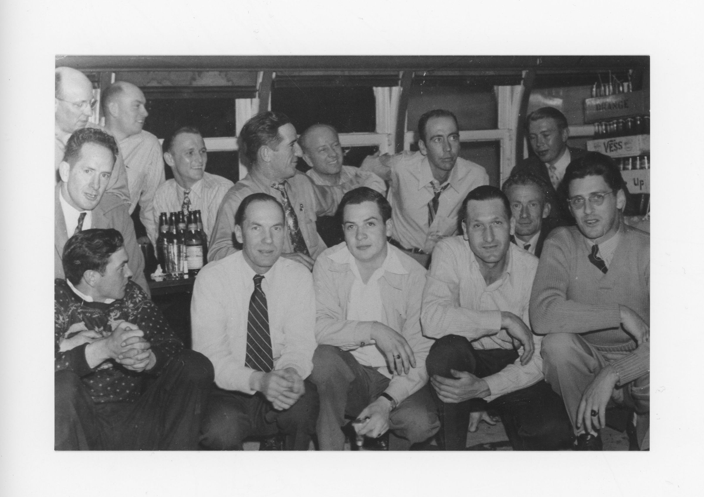 This picture was taken in the Crossroads Inn in North Farmington. Three men on the front row center are Merrill Scoffield, Roy Sanders, Sam Bloxham. Shirley Ball and Vernell Swanger are on the back row, third from left and fifth from left.Collection