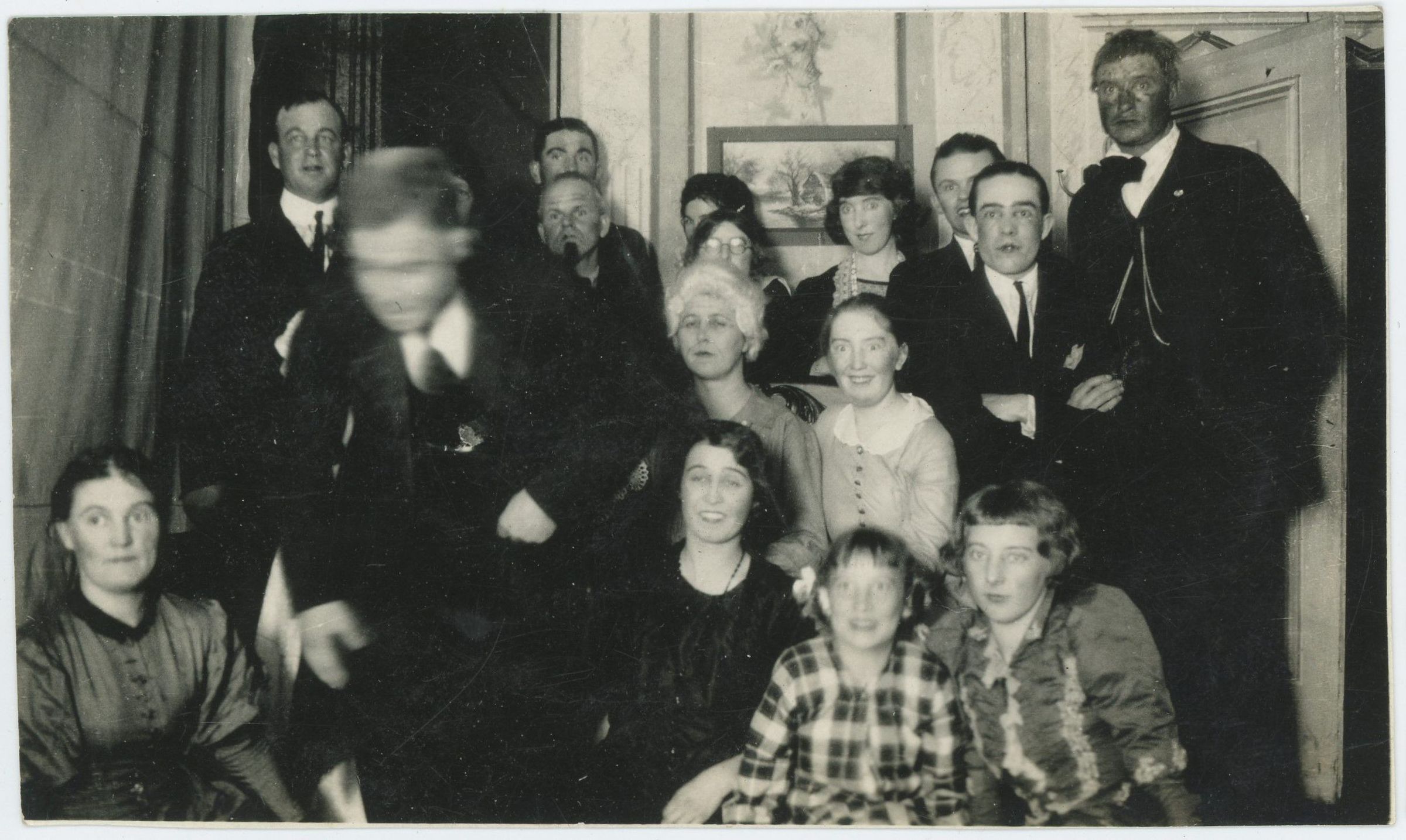 Cast of Kaysville stage play, "Three Live Ghosts," posing onstage.Photograph Details
