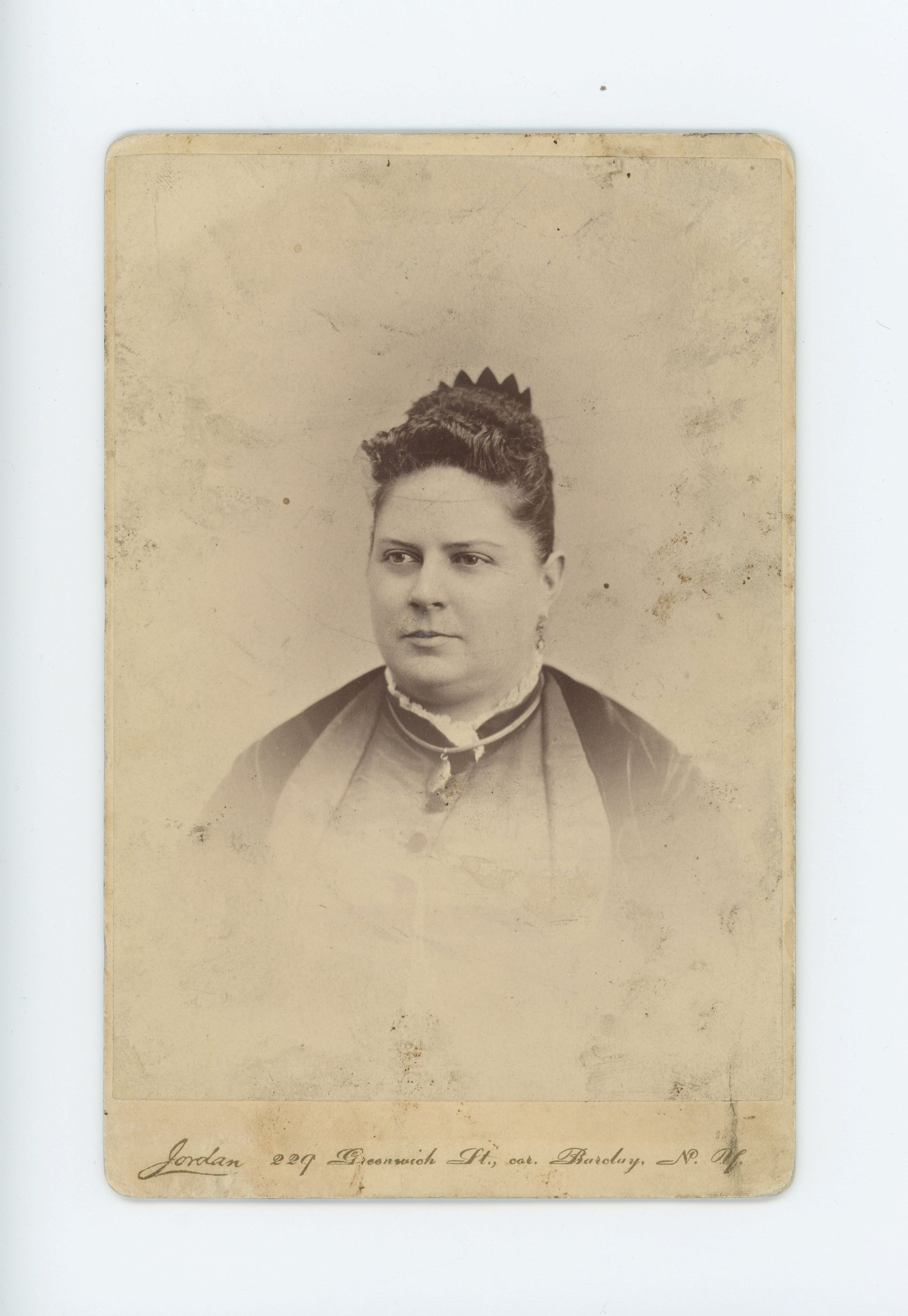 Woman wearing dark colored dress with frilly white collar and necklace.