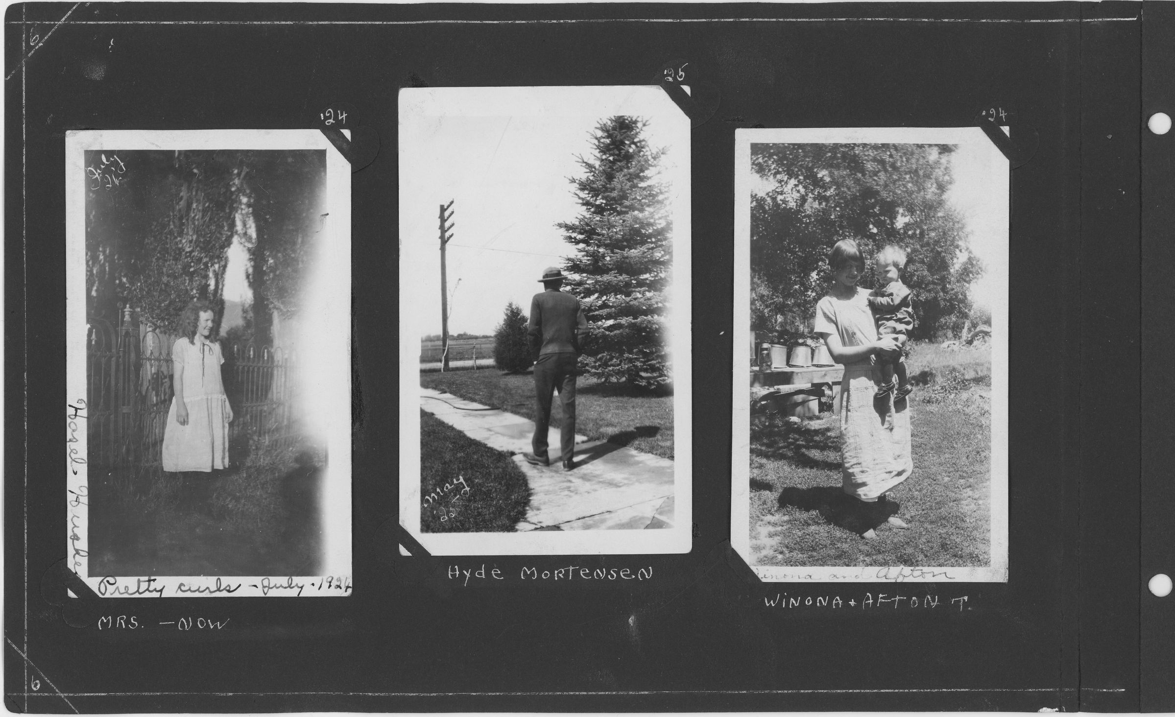 (Left to Right) Hazel ________, pretty curls July 1924, Mrs.- Now. Hyde Mortensen, May '25. Winona + Afton T.