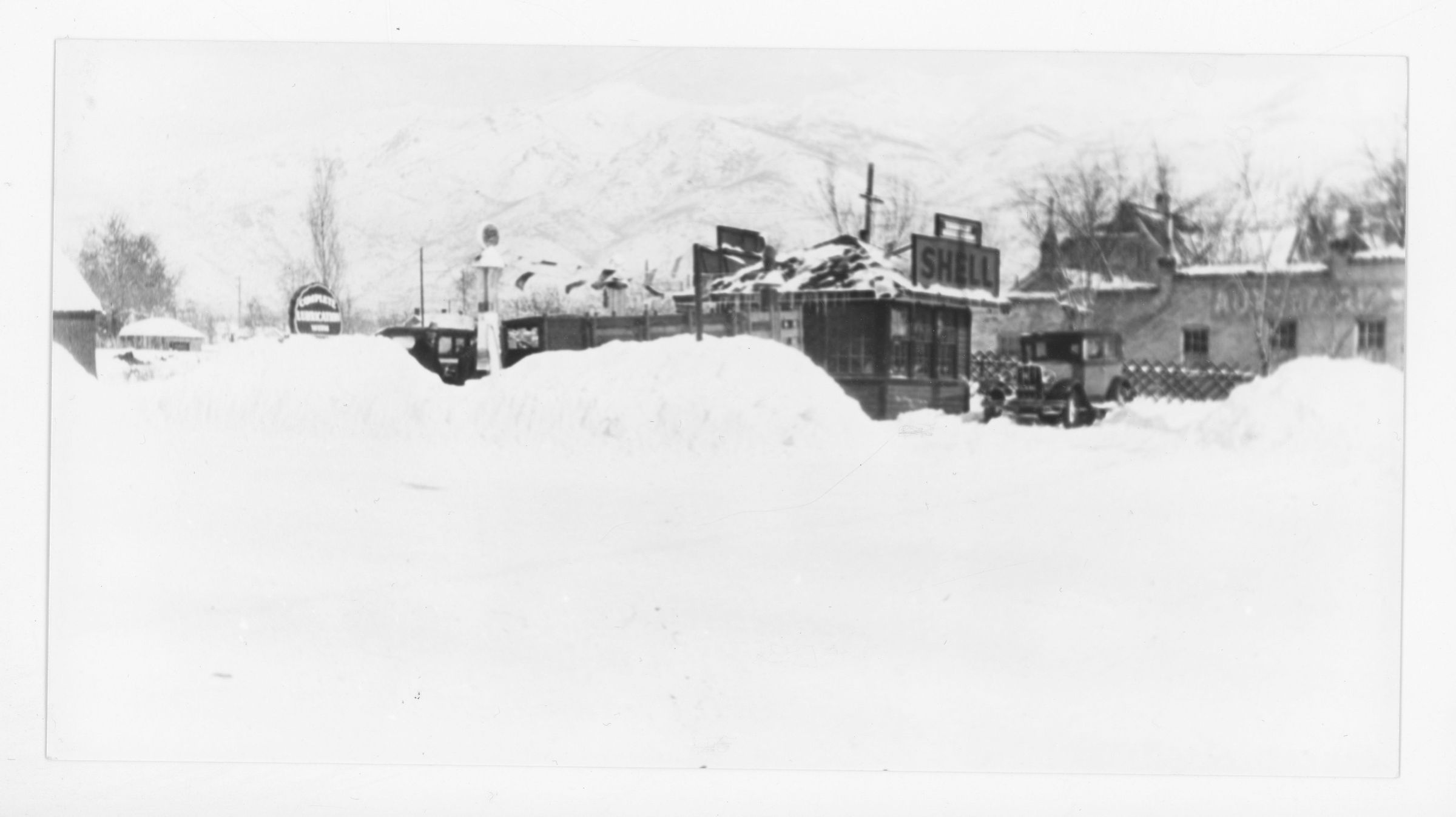 Snow-covered Main Street with Shell Gas Station and other buildings in the background.