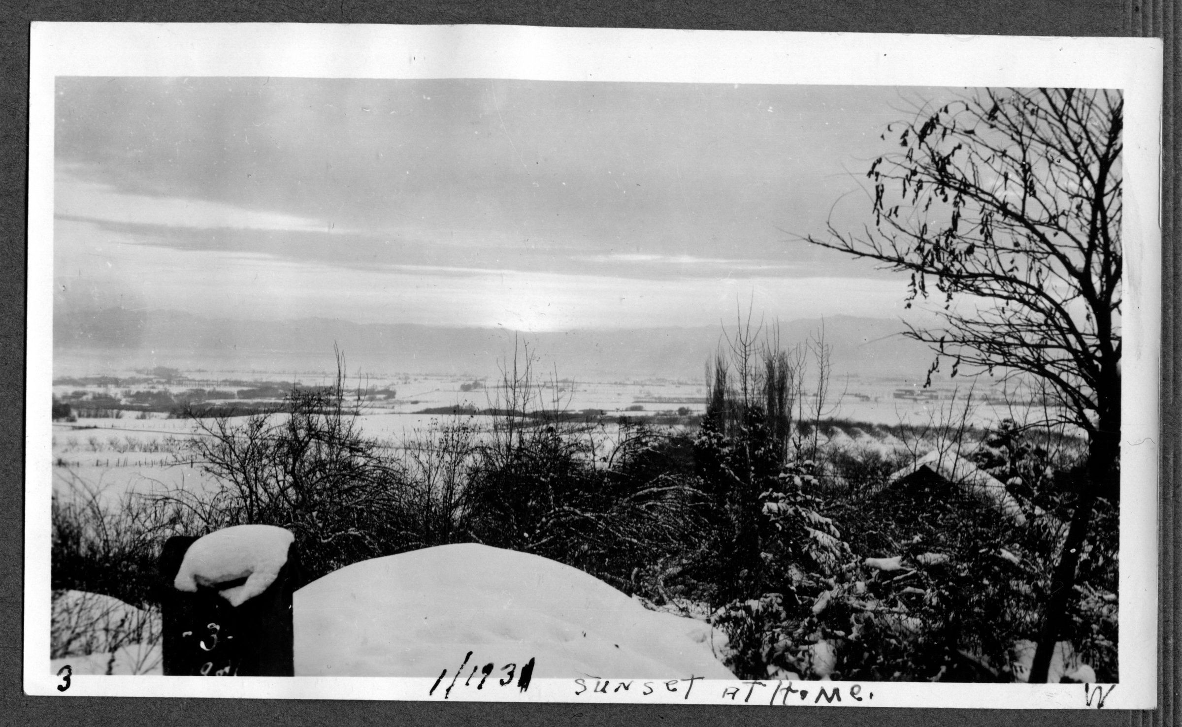 Snowy landscape at sunset taken from Butcher house on Mountain Road in east Kaysville.
