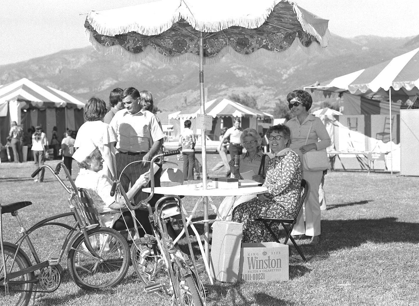 Organizers gathered around a table and umbrella at the Kaysvile bicentennial celebration.Photograph Details
