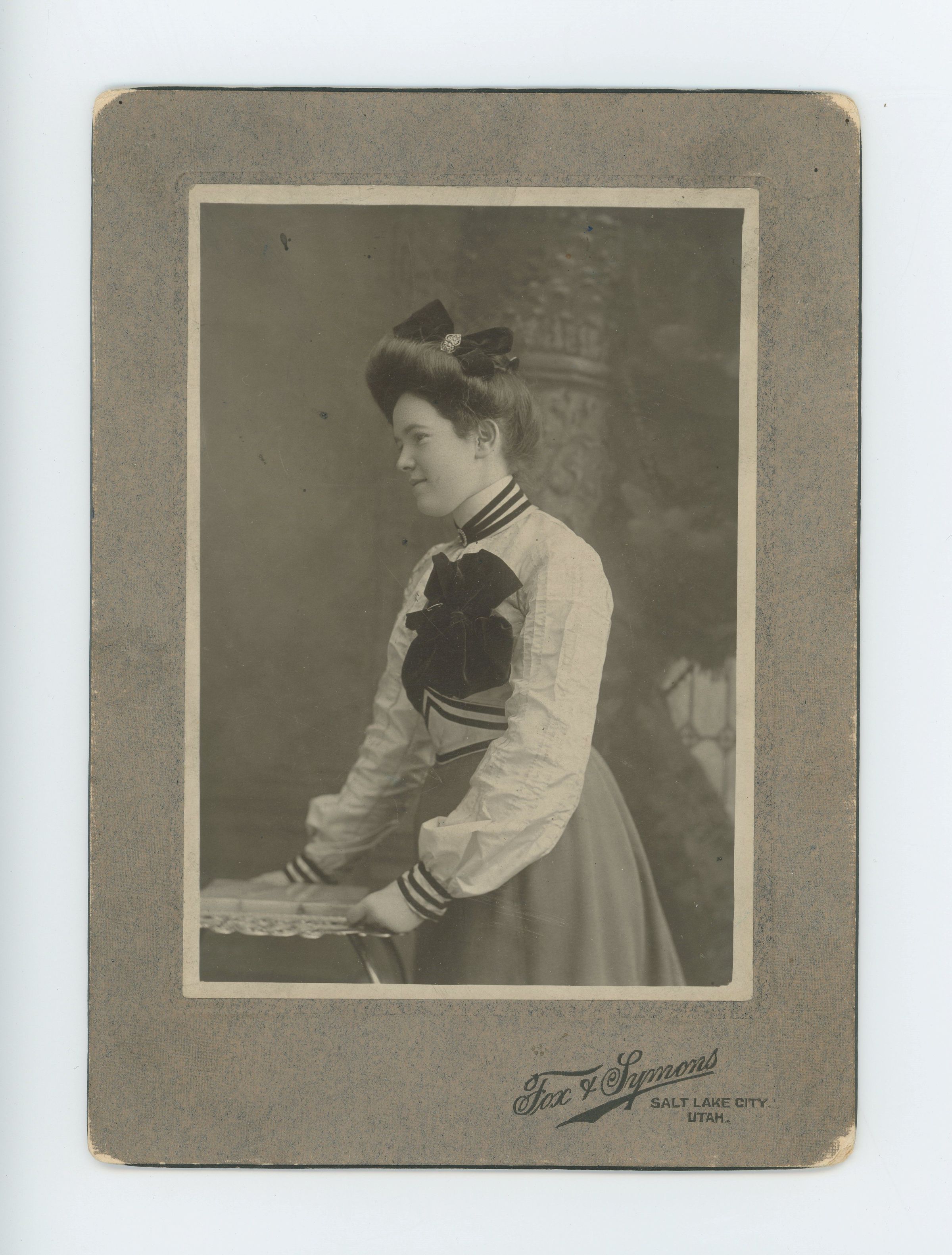Young woman wearing black and white blouse and skirt.Photograph Details