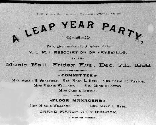 A leap year party invitation to a 1888 event directed by the Y. L. M. I. A. organization of the Kaysville Church of Jesus Christ of Latter-day Saints.Context