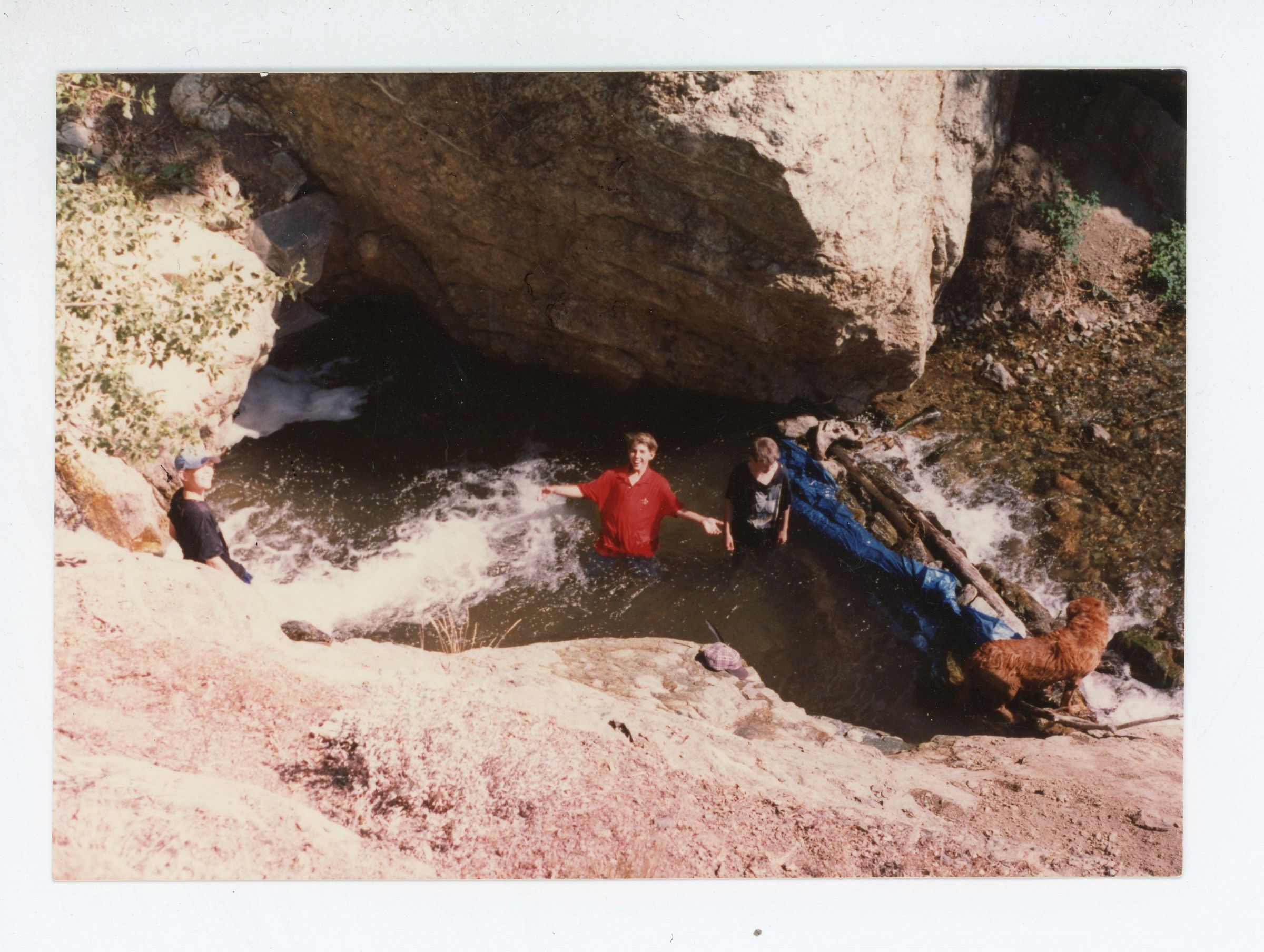 Scouts play with dog in water feature on north fork of Webb's Canyon. Snow Horse Stream flows into Webb's Canyon