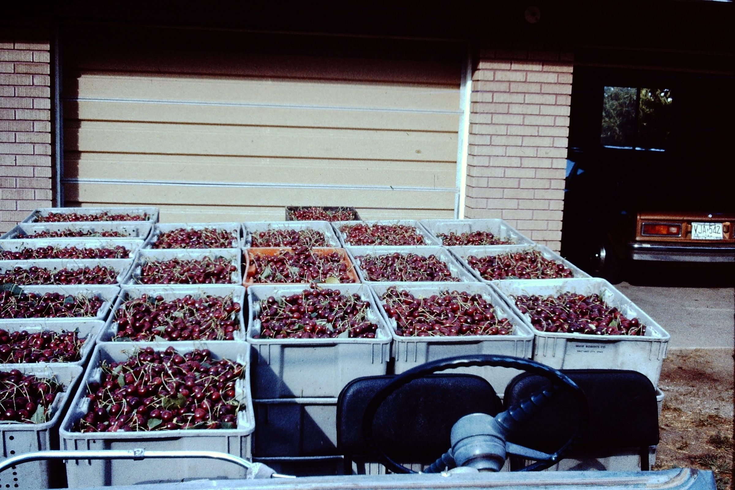 Cherries ready for sorting and selling outside garage at home of Glenn and Beth Manning of Fruit Heights.Photograph Details