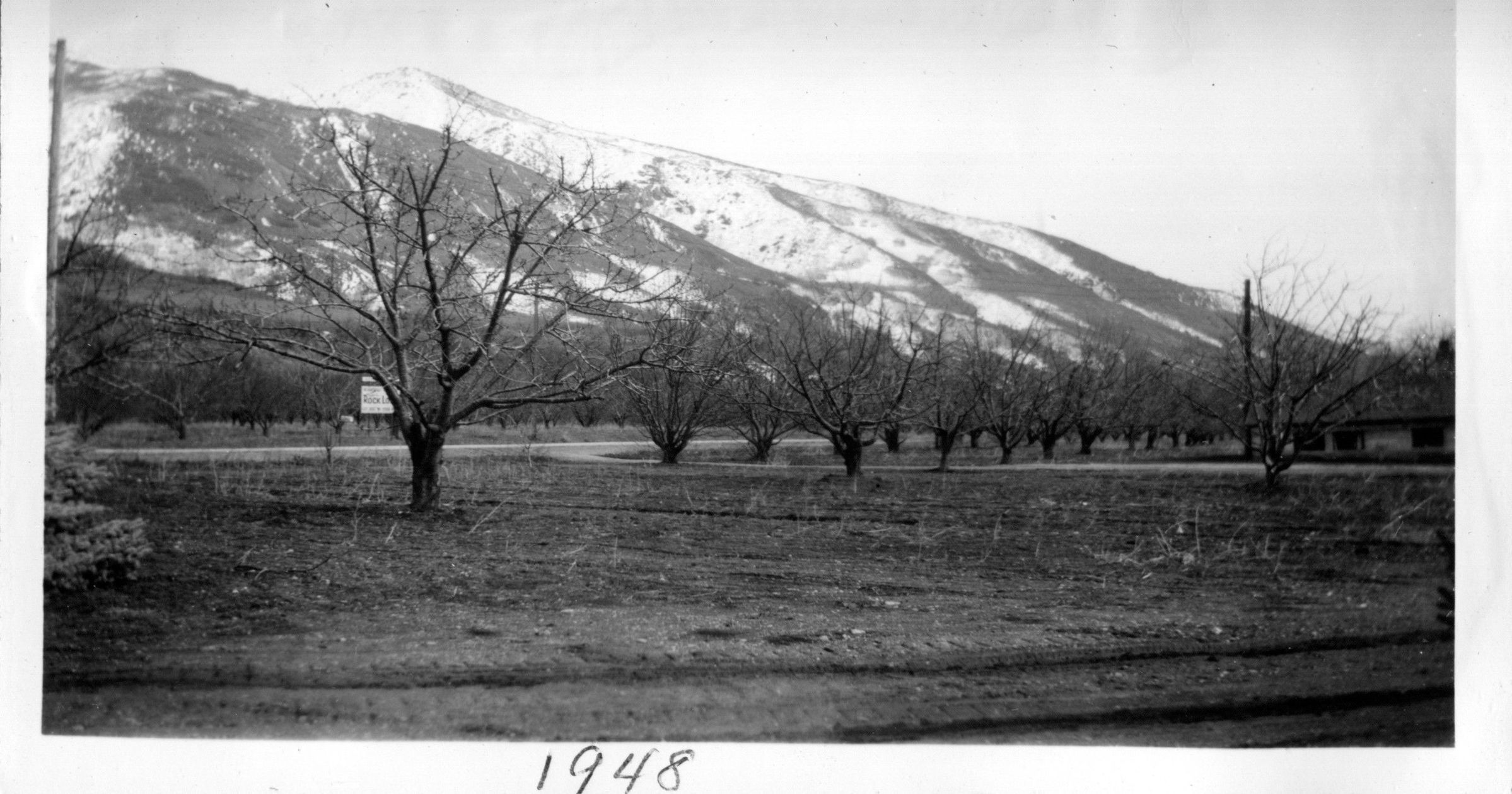 Butcher orchard in forefront with mountains east of Kaysville in distance. Mountain Road in background; Vern Butcher home on the right. Sign along the road advertises the Rock Loft in Fruit Heights.Photograph Details
