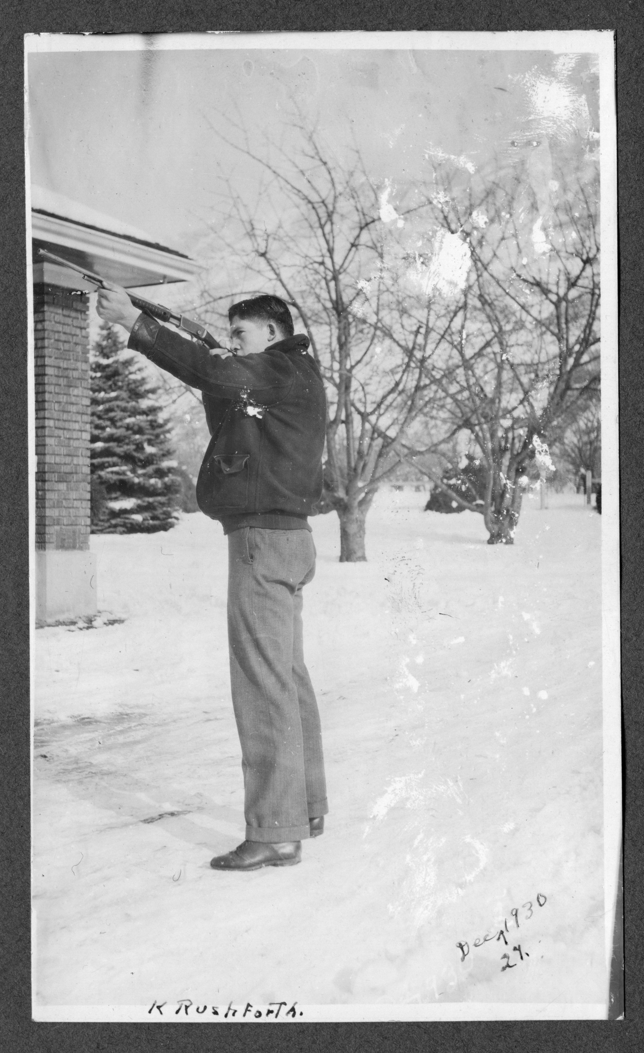 K. Rushforth sights rifle outside Butcher home on old Mountain Road in east Kaysville, later Fruit Heights.Photograph Details