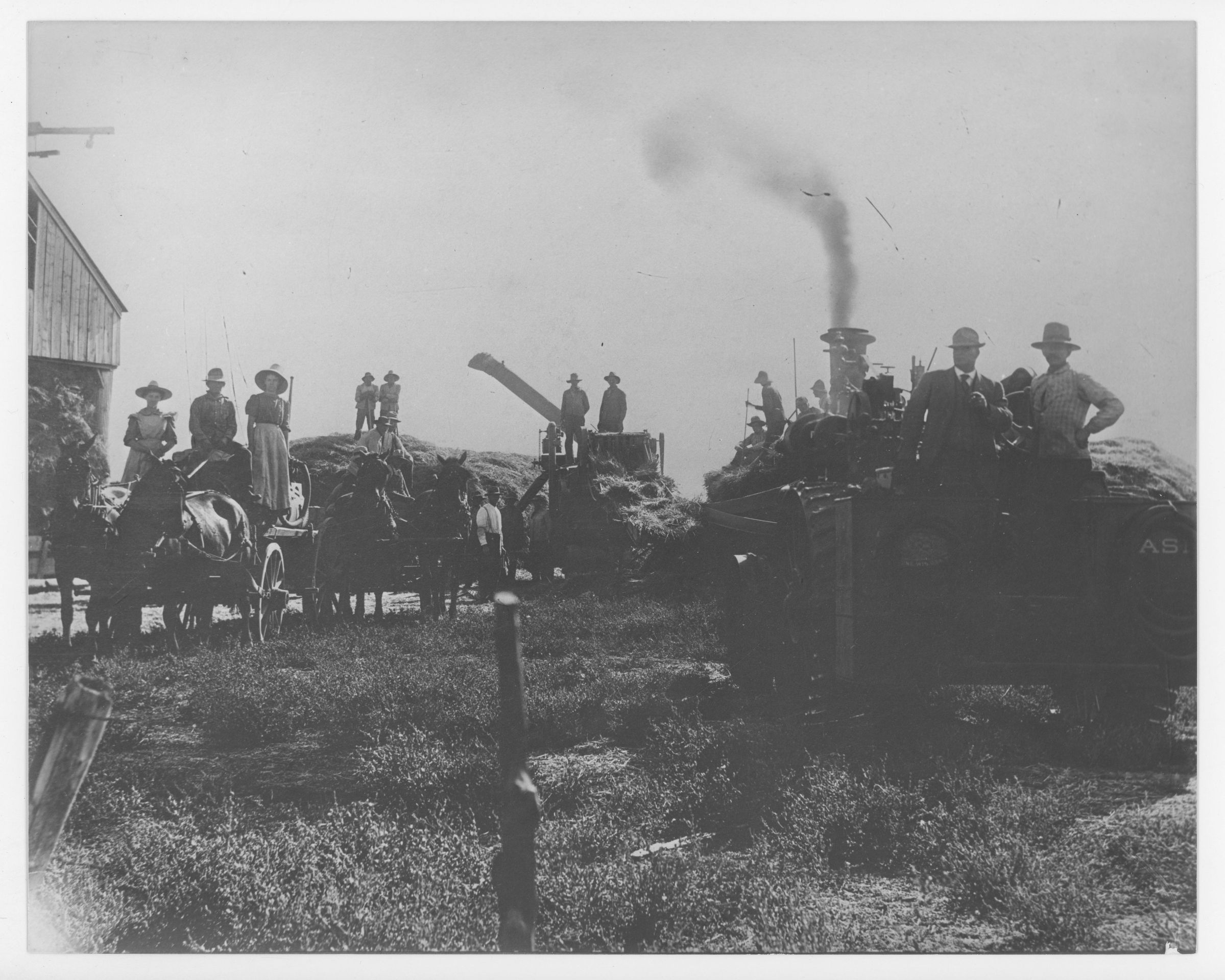Men and women working as part of a threshing crew. The crew used both wagons, horses, and large agricultural machinery.