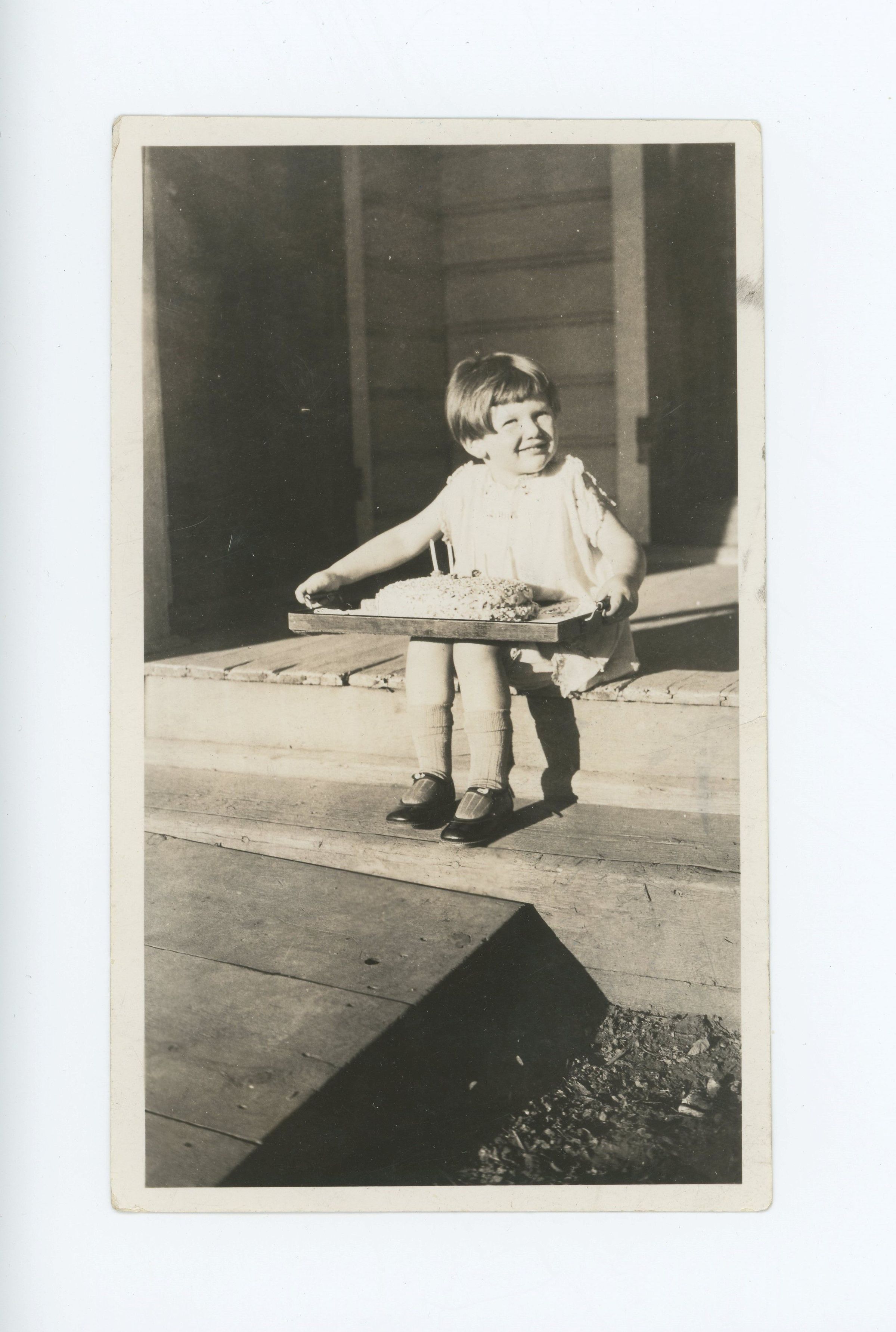 Young girl sitting on porch and holding pan of cake with candles in it.Photograph Details