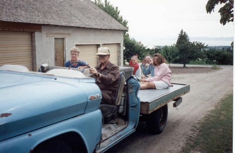 Alan Manning and grandchildren ride in home-modified flatbed truck used to transport fruit crates to sorting shed and also delivery to Rock Loft for cherry processing.Photograph Details