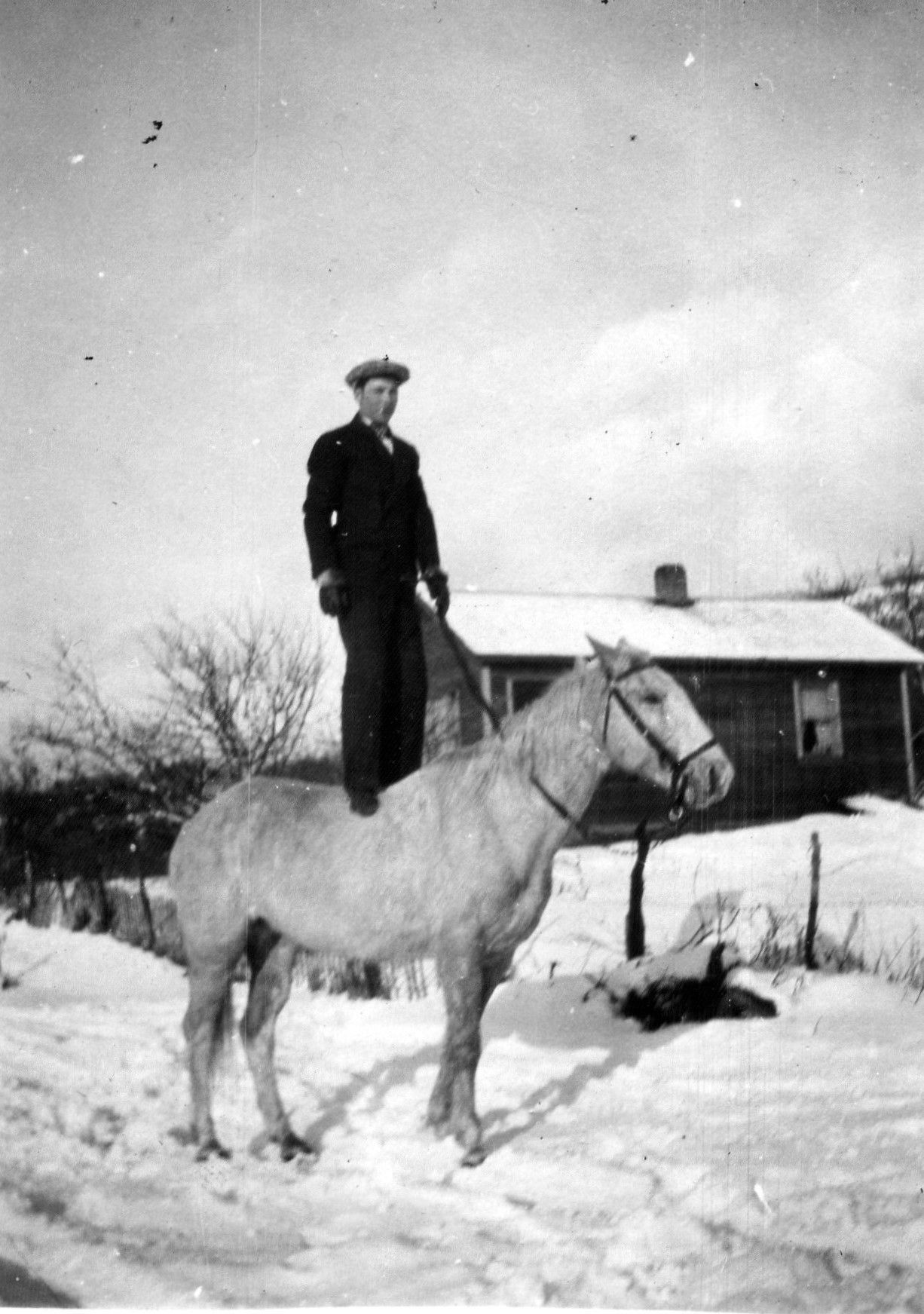 Man standing on the back of a horse with a house and trees in the background.Photograph Details
