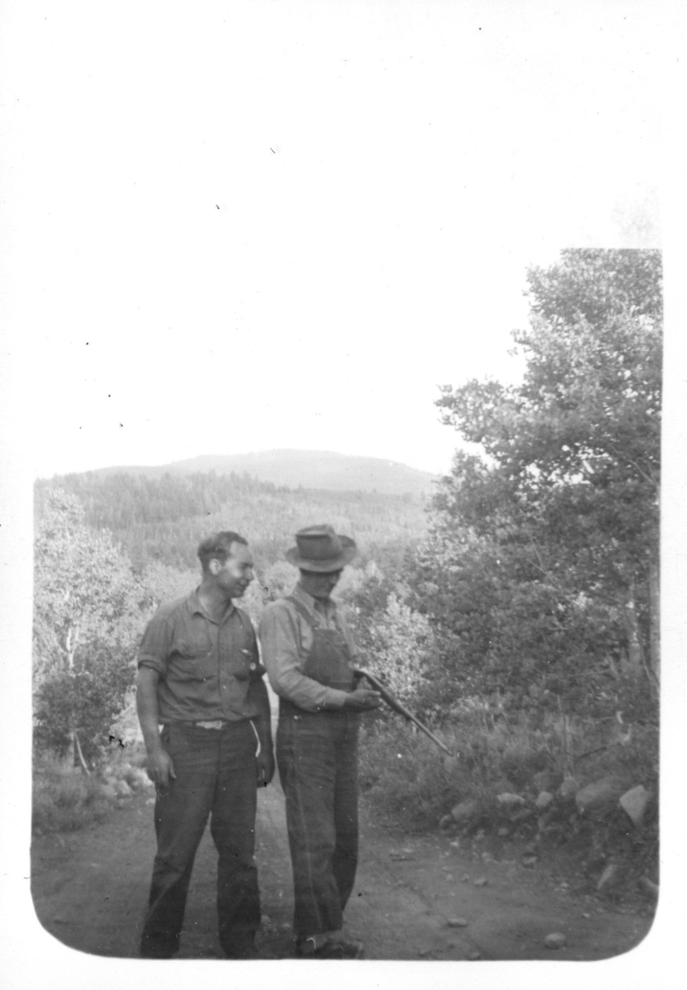 Alden Burton, left, and Carl Butcher carrying a gun at unknown location.Photograph Details