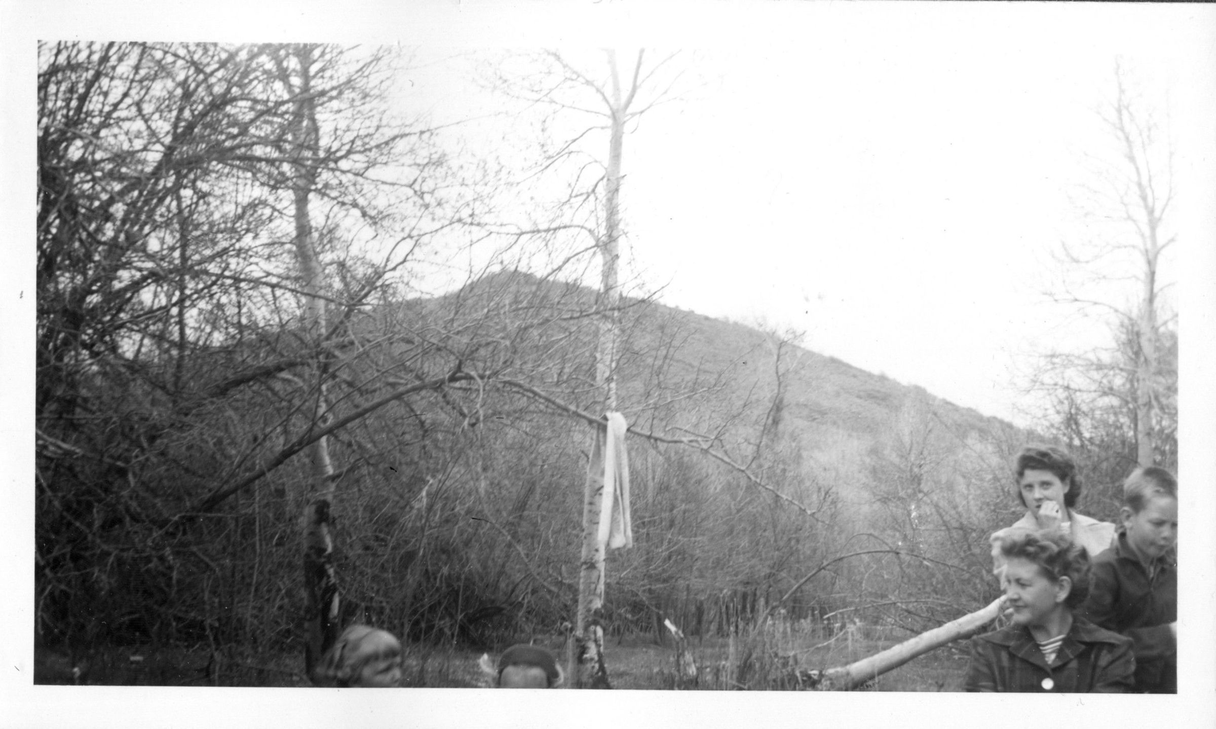 Butcher family recreating in forested area. Carrie Butcher, front right.Photograph Details