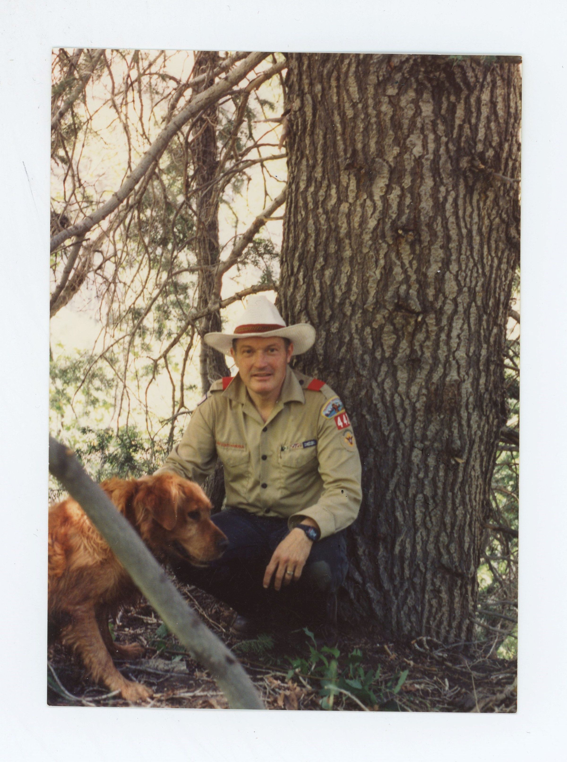 Scoutmaster Mike Goodsell with his dog on trip to Snow Horse Ridge.Photograph Details