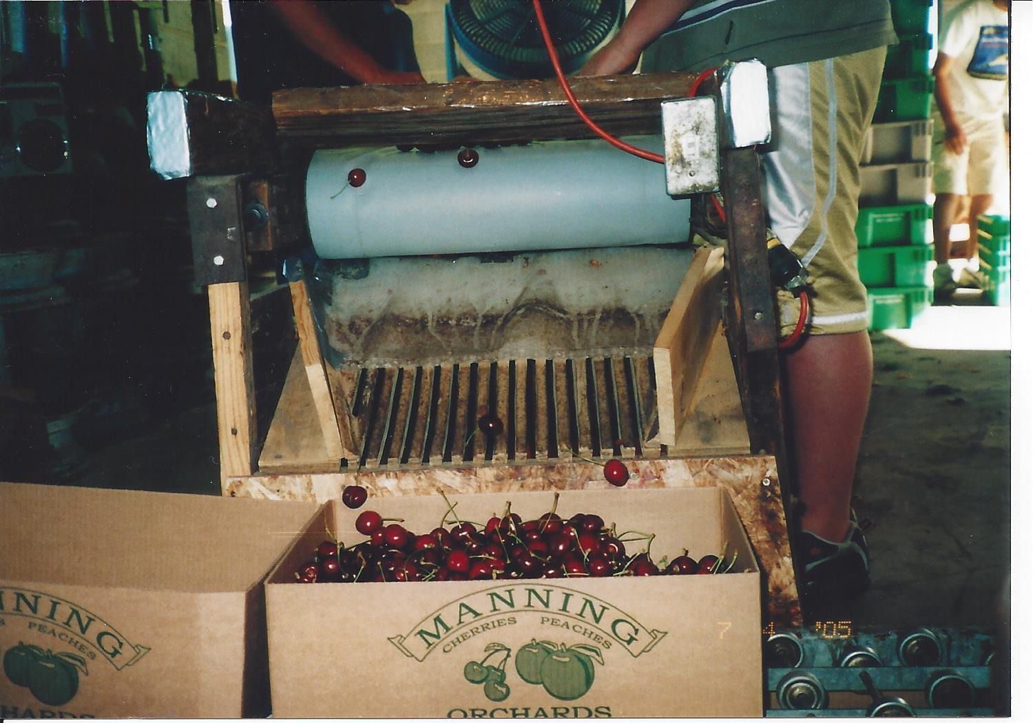 Cherries exiting sorting belt and filling boxes at harvest time. Orchard belonged to Glenn and Beth Manning of Fruit Heights.Photograph Details