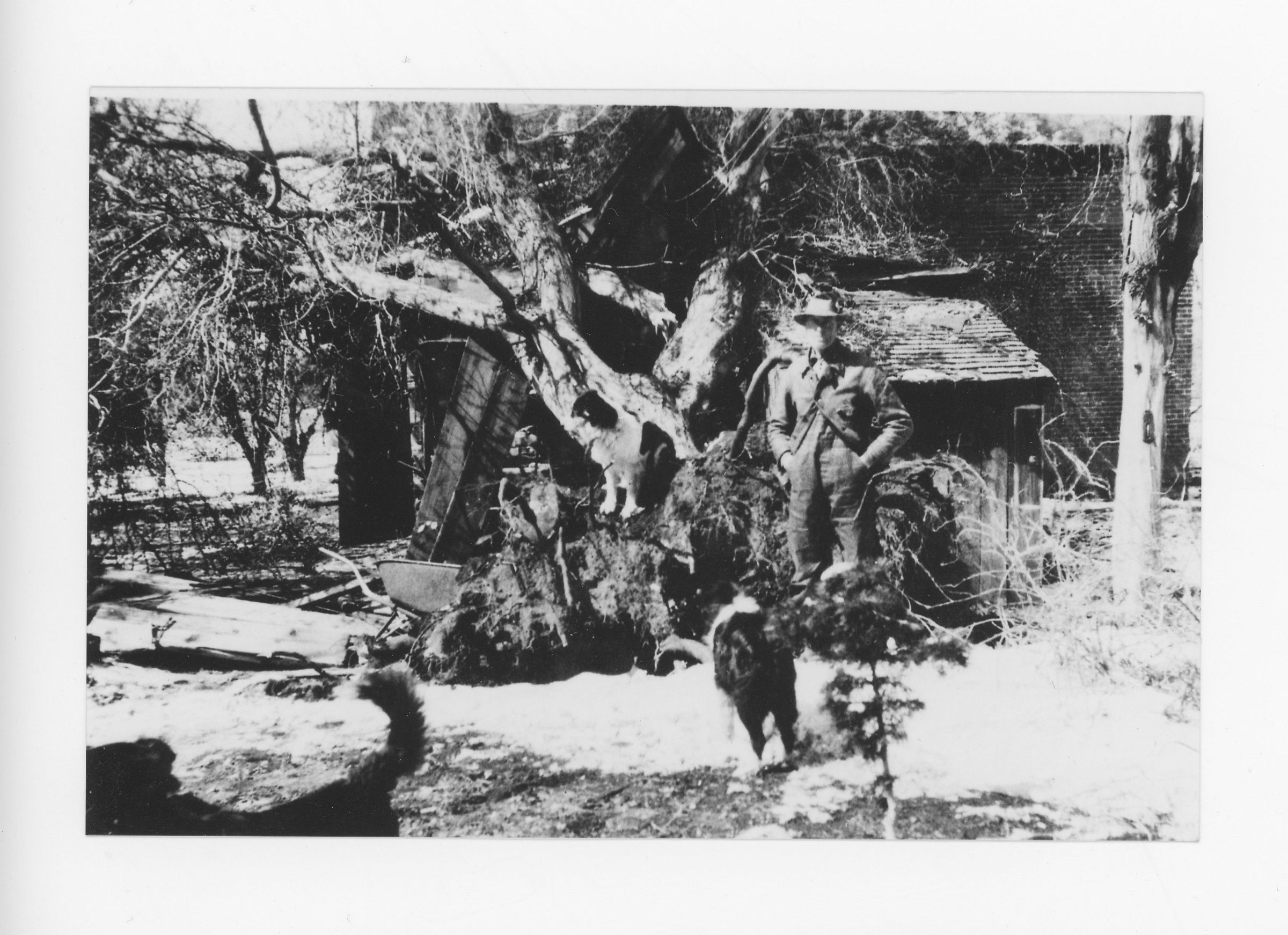 Ward family member and dog standing in front of home. The uprooted tree was the result of a severe East Wind.Photograph Details